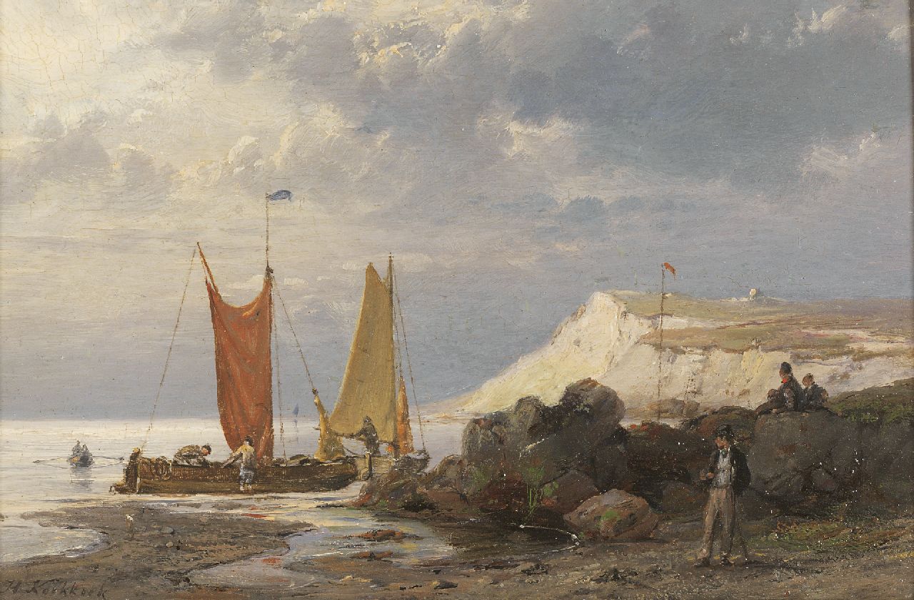 Hermanus Koekkoek kunstwerk • schilderij • voorheen te koop Afgemeerde vissersboten bij een rotskust