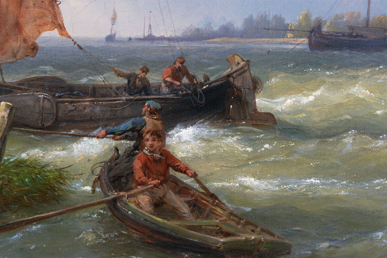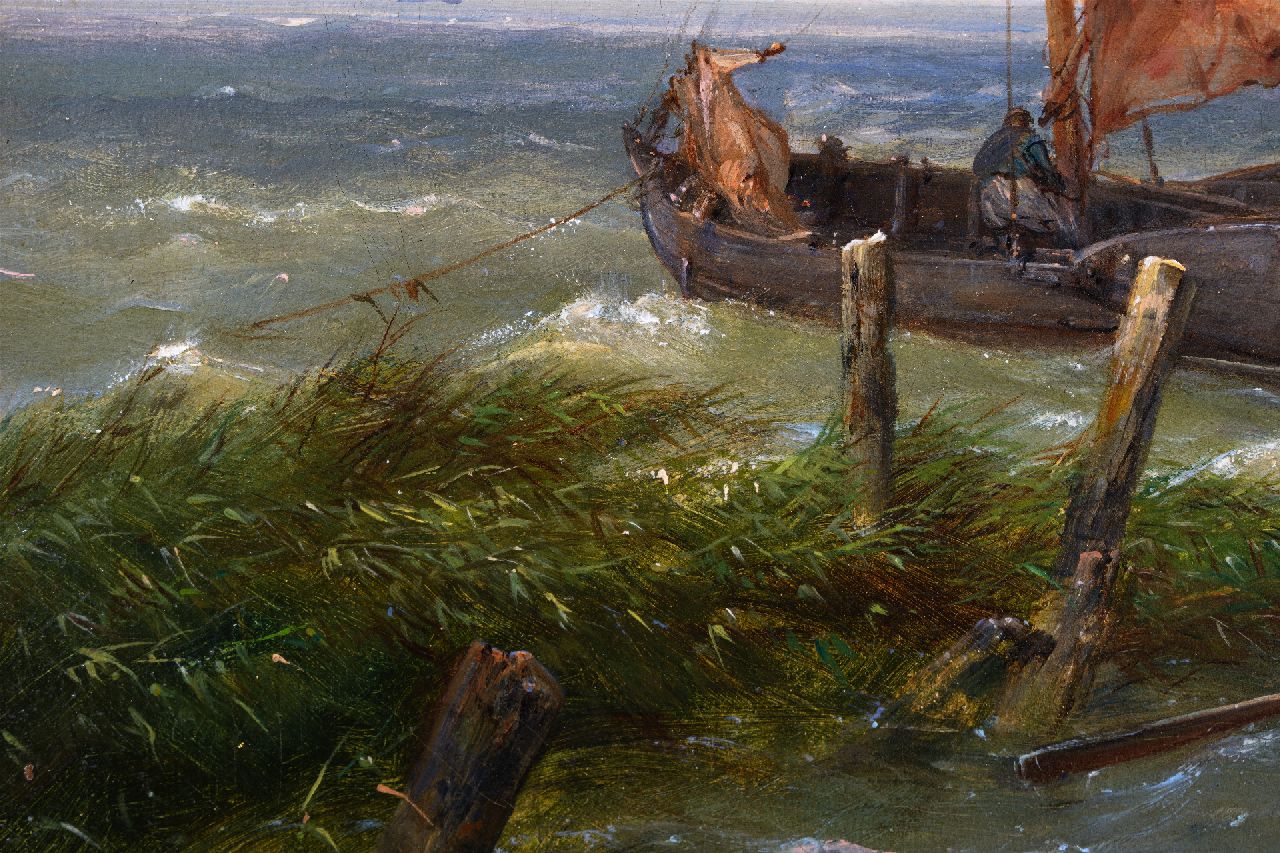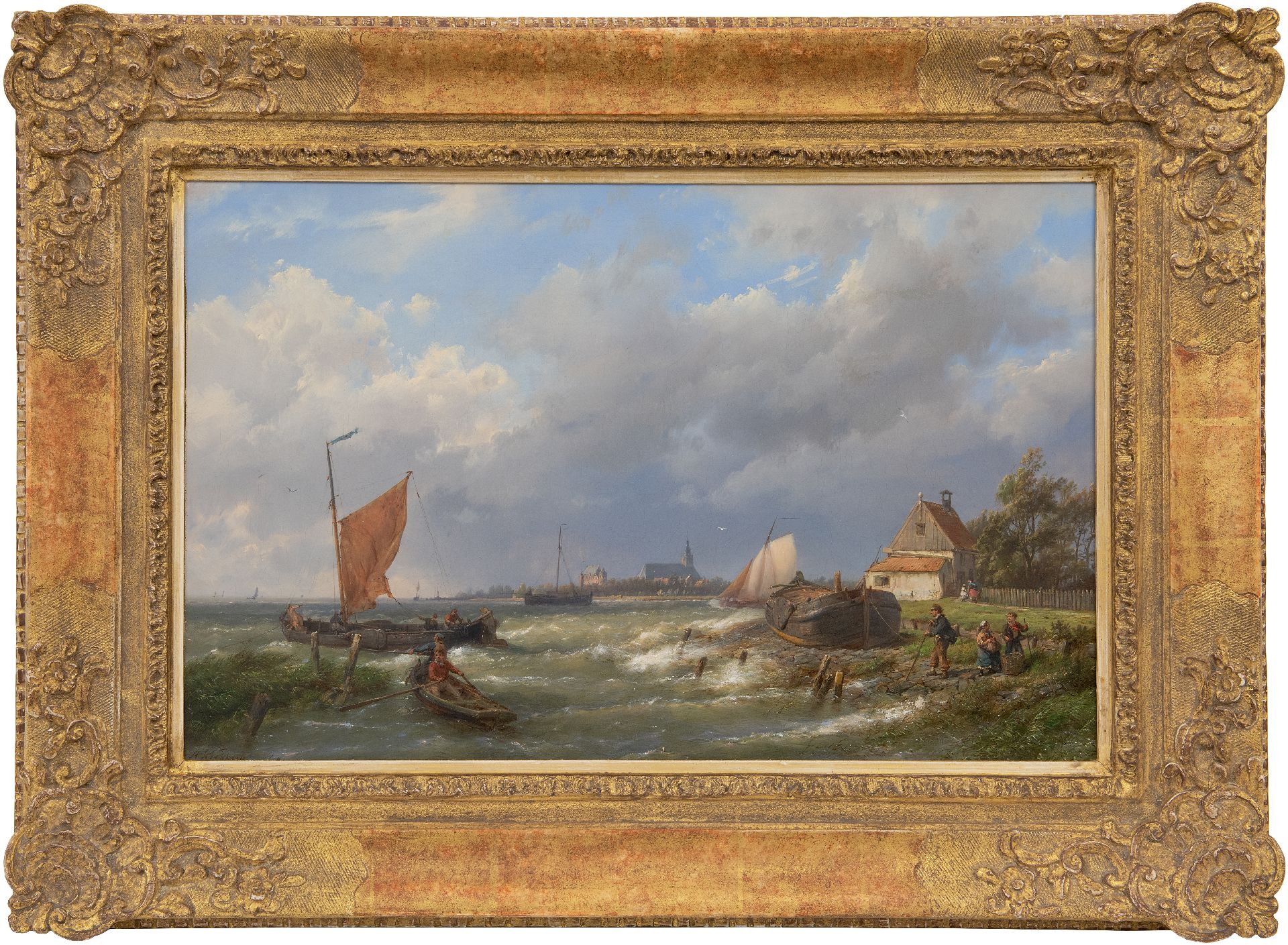 Hermanus Koekkoek kunstwerk • schilderij • voorheen te koop Een stevige bries aan Hollandse kust met dorp in het verschiet