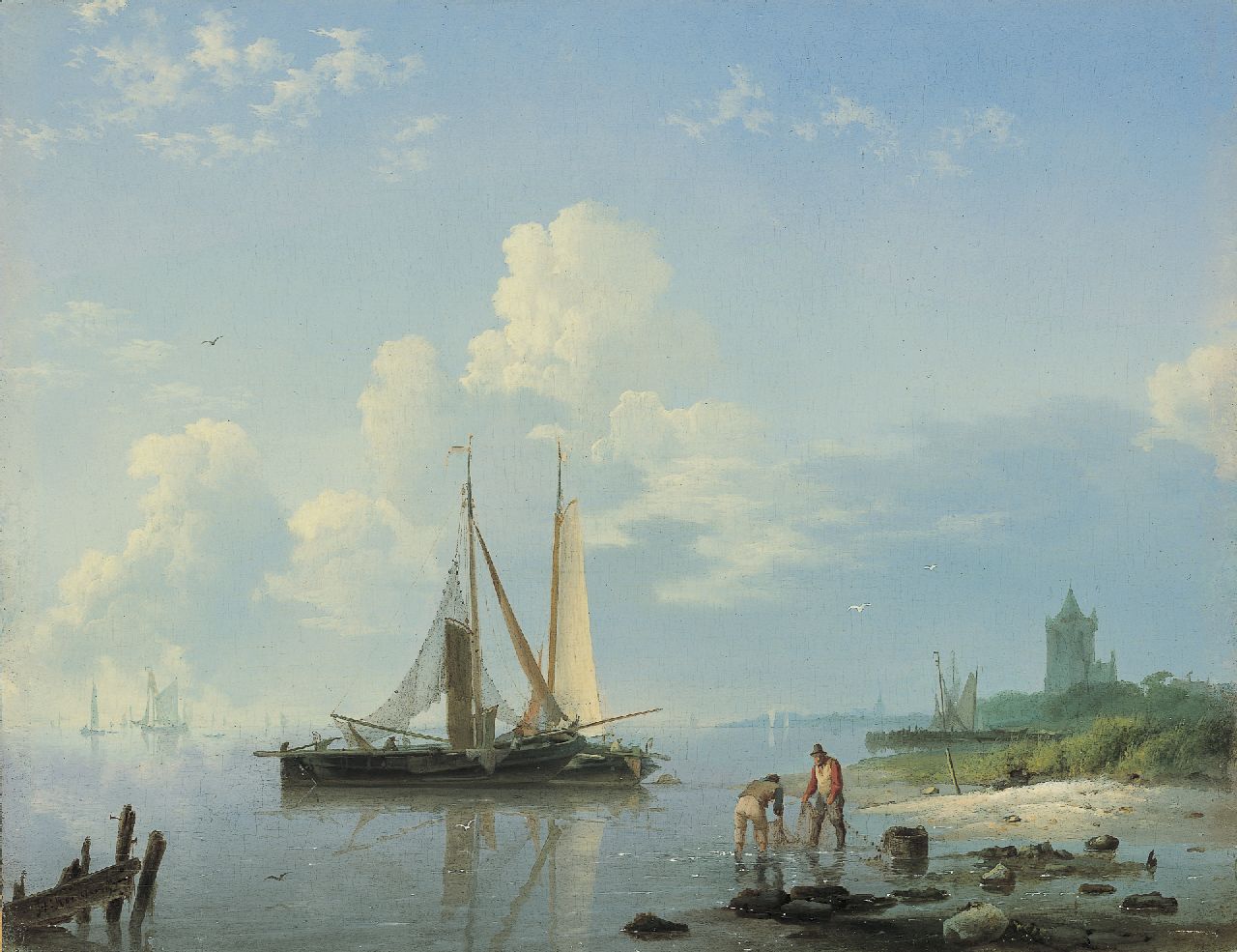 Hermanus Koekkoek kunstwerk • schilderij • voorheen te koop Kustgezicht met vissers bij windstilte