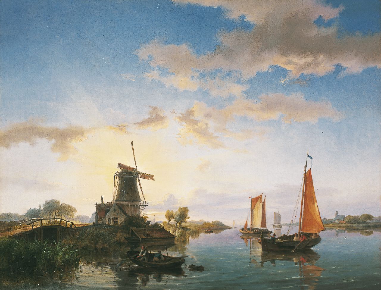 Hermanus Koekkoek kunstwerk • schilderij • voorheen te koop Rivierlandschap met schepen en molen bij zonsondergang