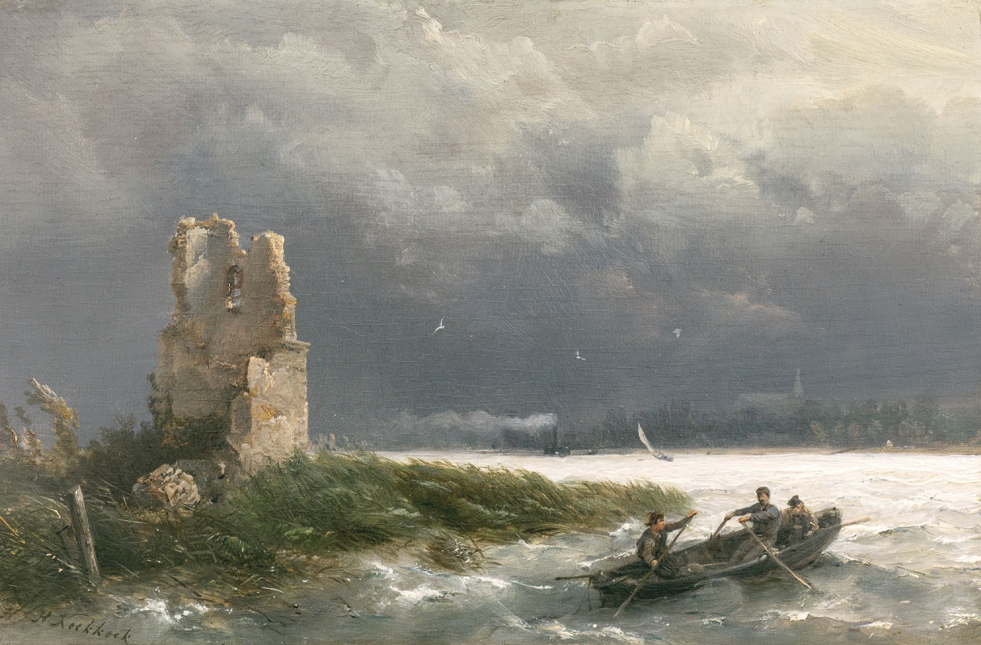 Hermanus Koekkoek kunstwerk • schilderij • voorheen te koop Roeiboot op een rivier bij stormachtig weer