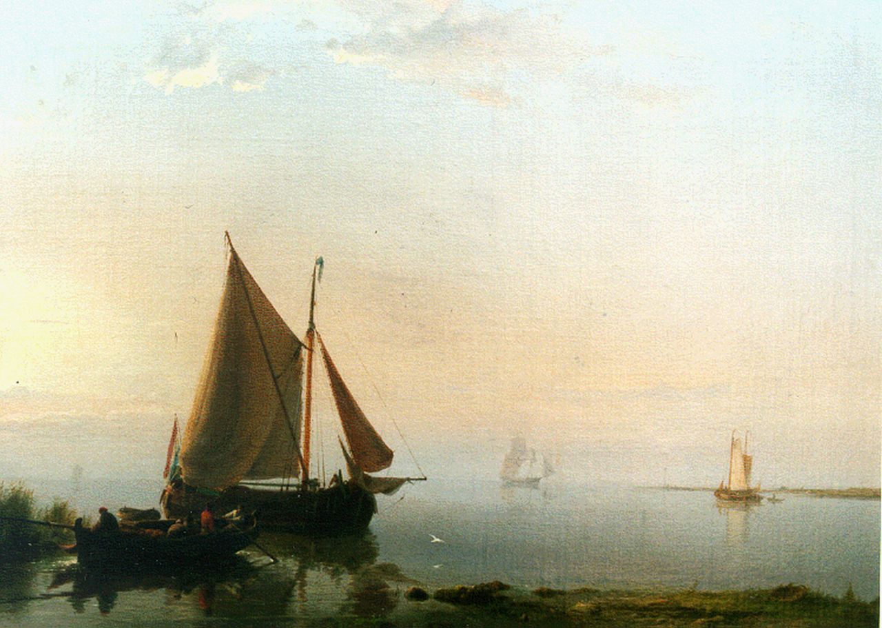 Hermanus Koekkoek kunstwerk • schilderij • voorheen te koop Schepen voor de kust bij zonsondergang
