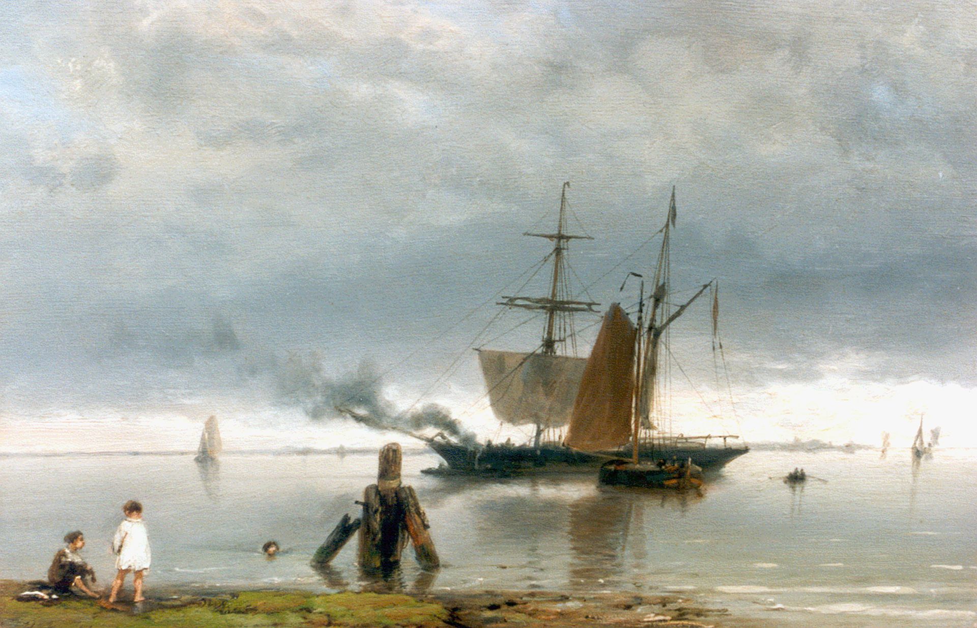 Hermanus Koekkoek kunstwerk • schilderij • voorheen te koop Schoenerbrik op kalm water met kinderen etc.