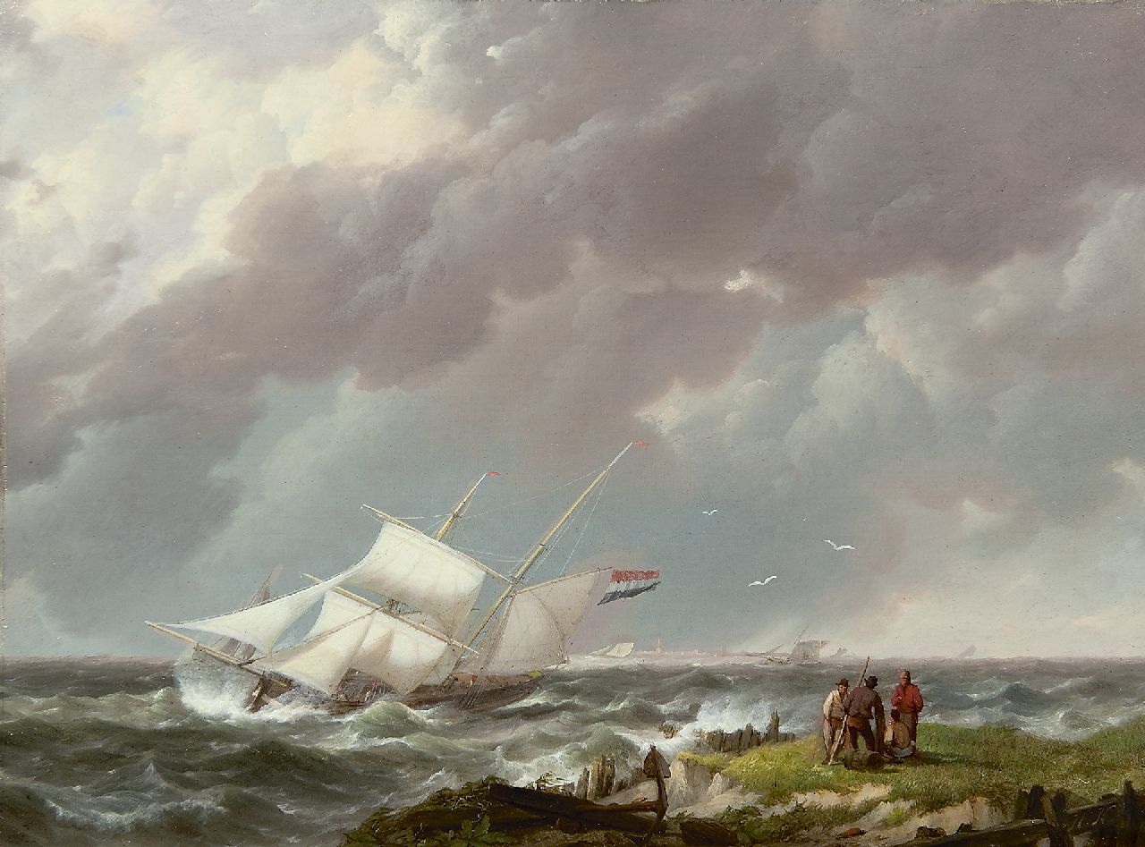 Hermanus Koekkoek kunstwerk • schilderij • voorheen te koop Schoenerbrik op woelige zee, bij een havenmond