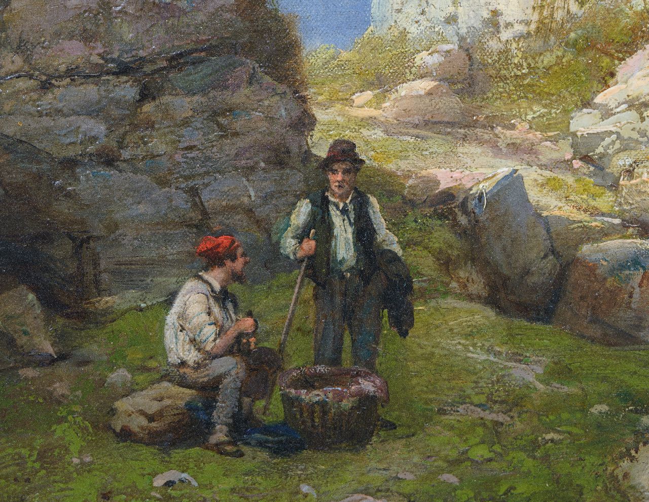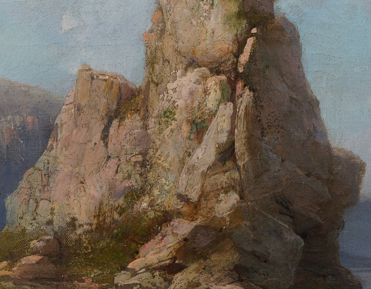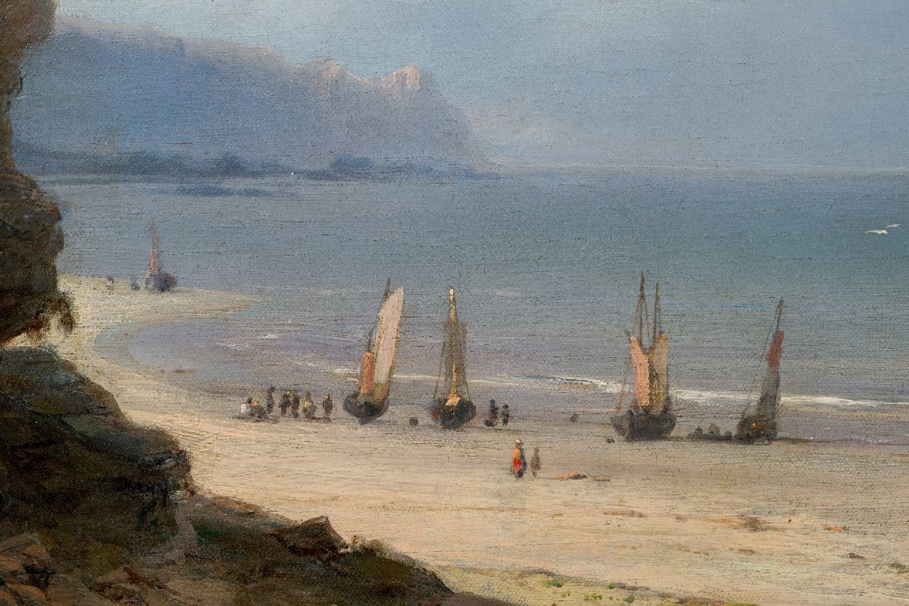 Hermanus Koekkoek kunstwerk • schilderij • te koop Strandgezicht met vissers en schepen langs een rotskust