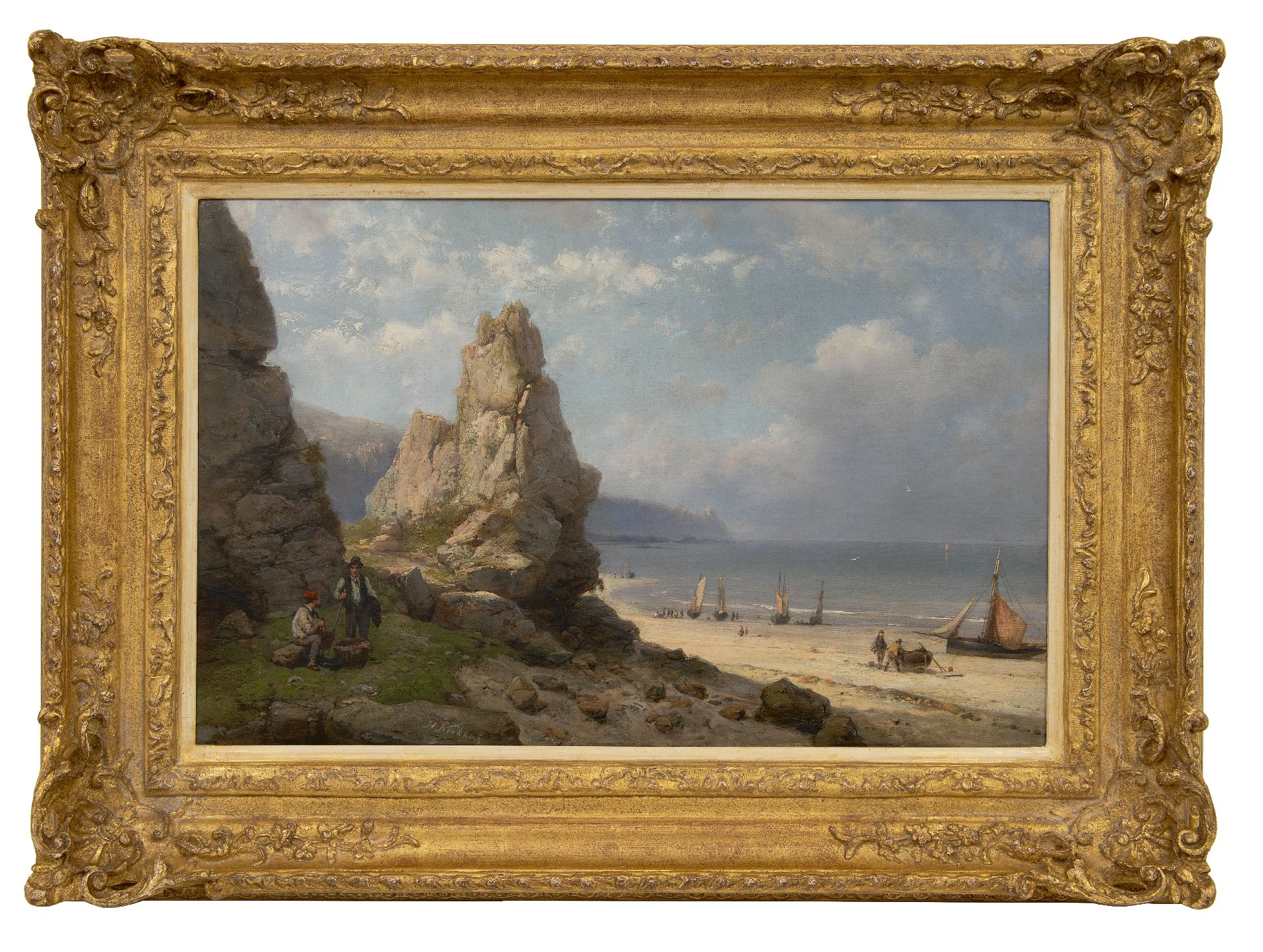 Hermanus Koekkoek kunstwerk • schilderij • te koop Strandgezicht met vissers en schepen langs een rotskust