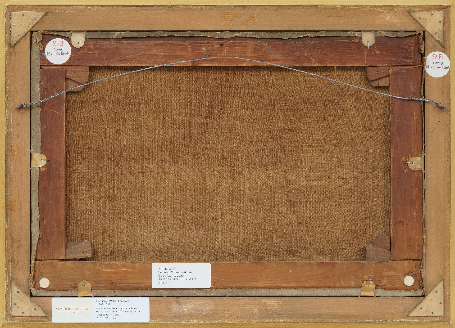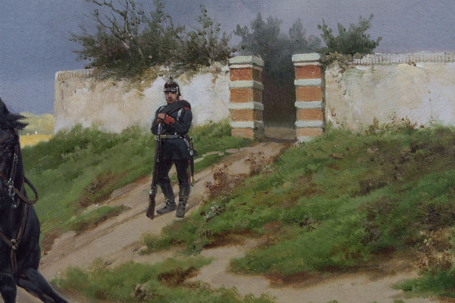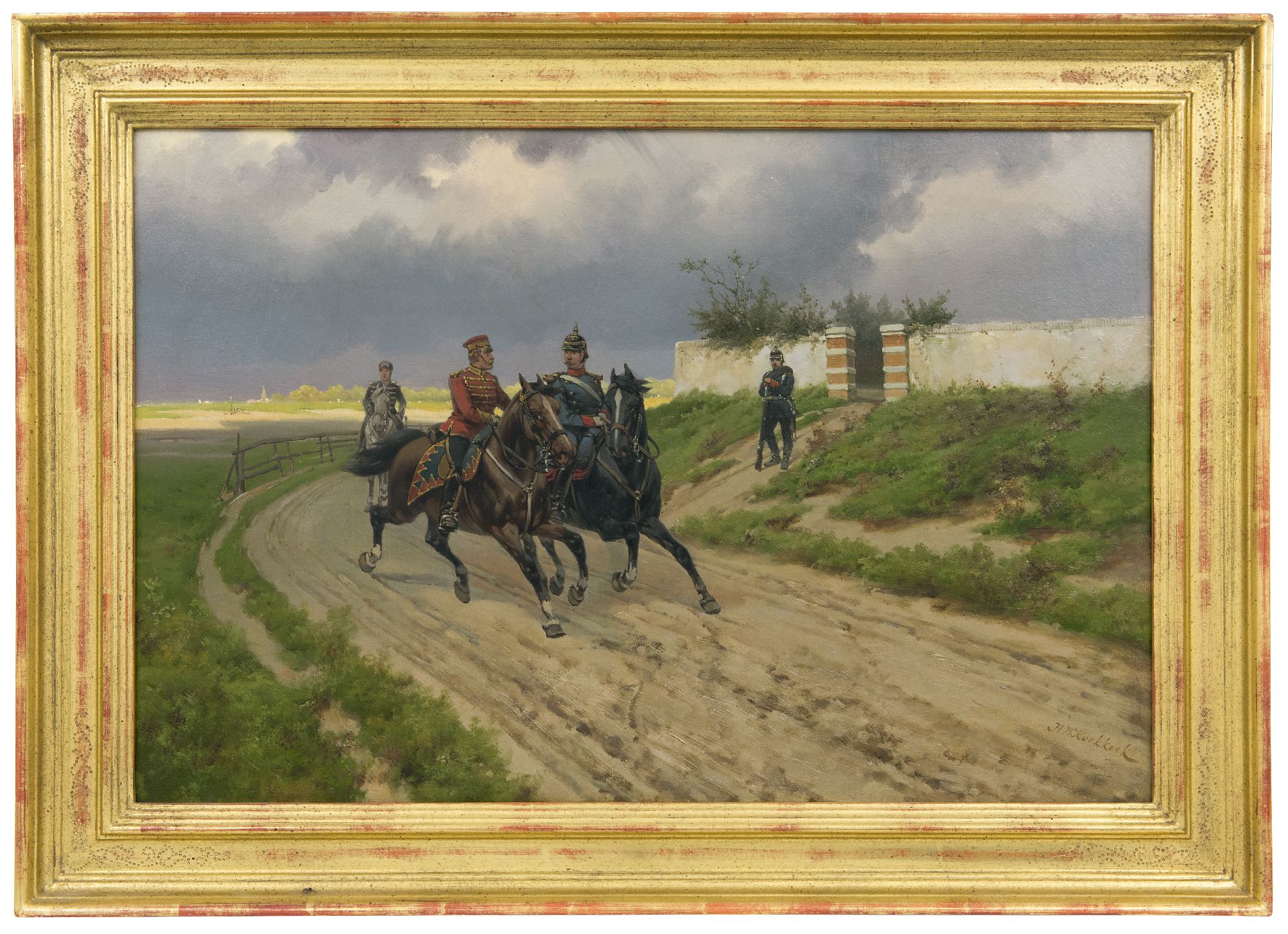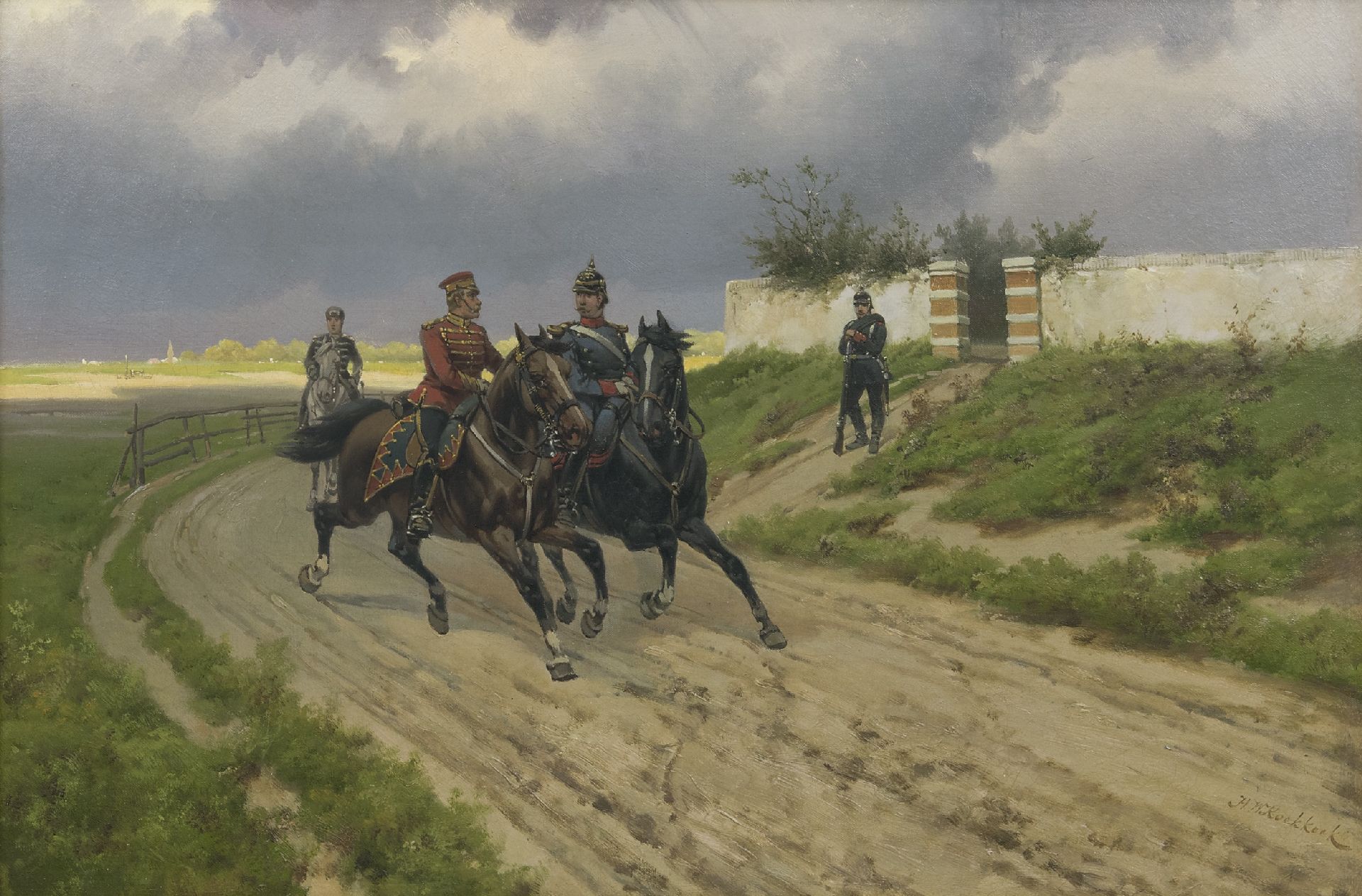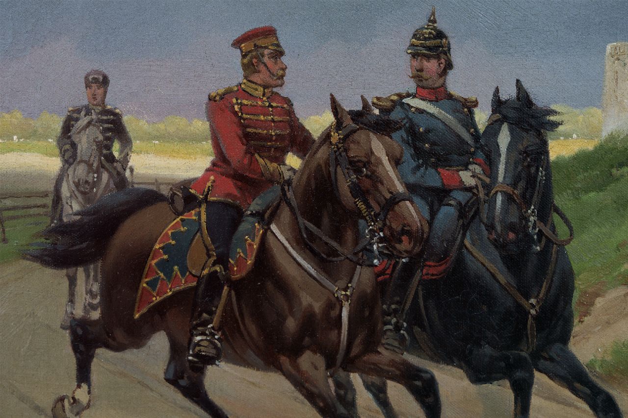 Hermanus Willem Koekkoek schilderde zijn Cavaleristen te paard in 1890. Koekkoek, opgeleid in de romantische traditie, maakt er een zaak van om zijn militairen zo gedetailleerd mogelijk weer te geven. Hun onderdeel en rang zijn herkenbaar aan kleuren, uniform en hoofddeksels. Het is bekend dat de schilder voorafgaand aan zijn schilderijen altijd gedegen onderzoek deed naar militaire kledij en wapens, en zo kan vastgesteld worden dat het hier gaat om Pruisische cavaleristen die op patrouille zijn. Koekkoek, die vanaf 1887 vier jaar in Londen woonde en er na 1901 weer naartoe terugkeerde, was daar beroemd geworden met voorstellingen van de Boerenoorlog en de Frans-Duitse oorlog (1870-1871). En hoewel de militairen veelal met serieuze zaken bezig zijn hebben de voorstellingen soms een humoristische ondertoon.