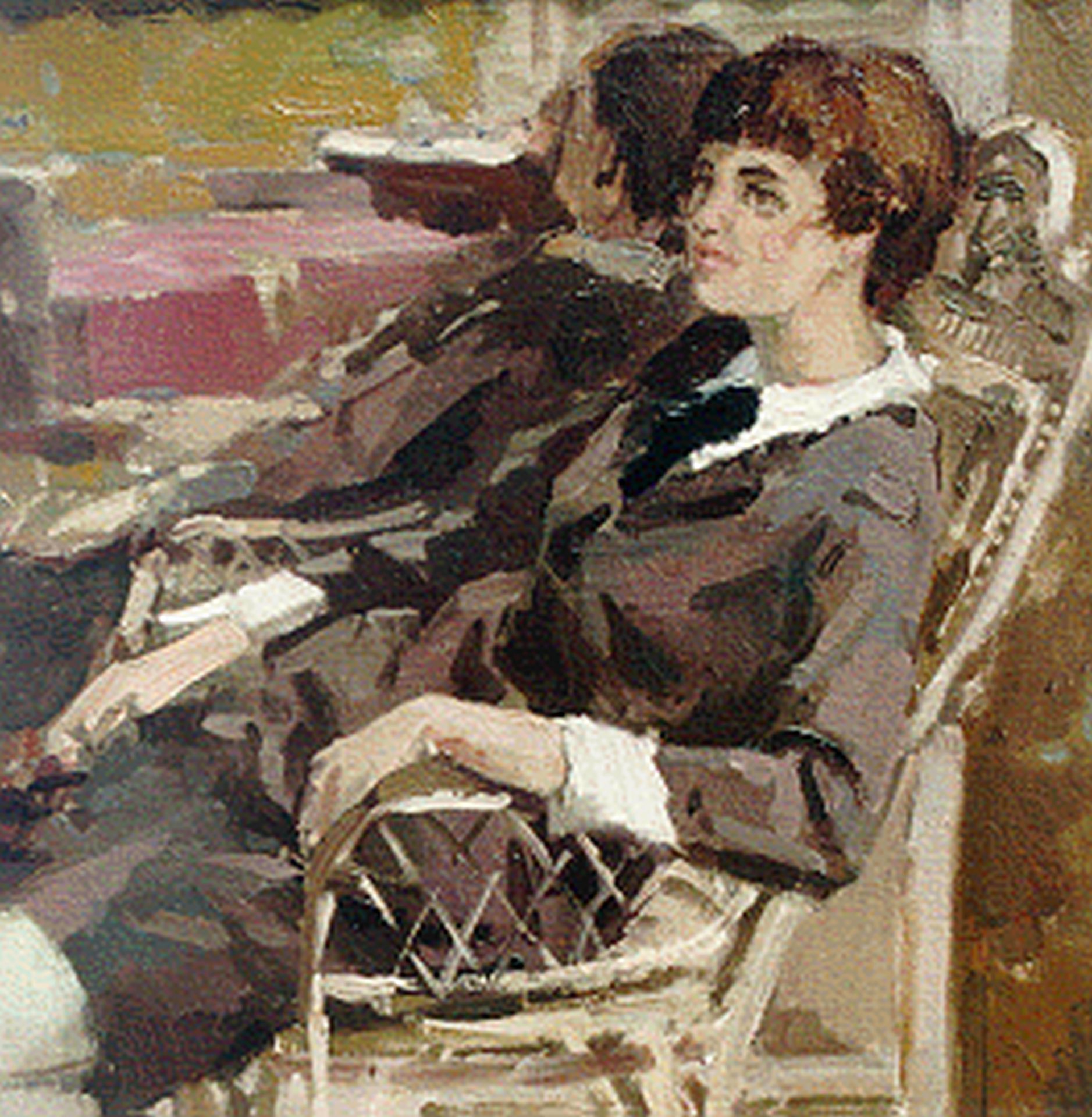 Hessel de Boer kunstwerk • schilderij • voorheen te koop Jongedame in rieten fauteuil voor een spiegel