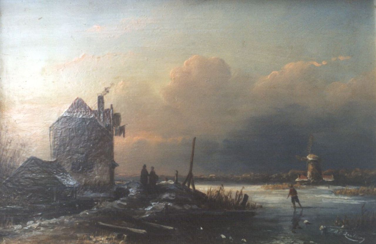 Hester Adriana Cornelia Zaalberg kunstwerk • schilderij • voorheen te koop Winterlandschap met wandelaars en schaatser op het ijs (i.o.)