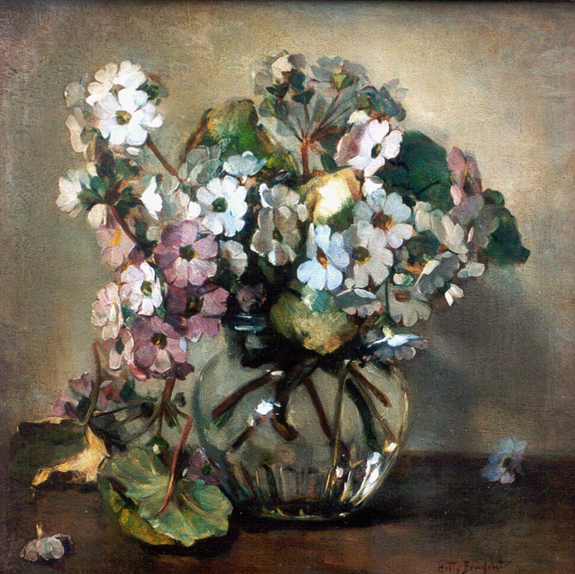 Hetty Broedelet-Henkes kunstwerk • schilderij • voorheen te koop Primula's in glazen vaas