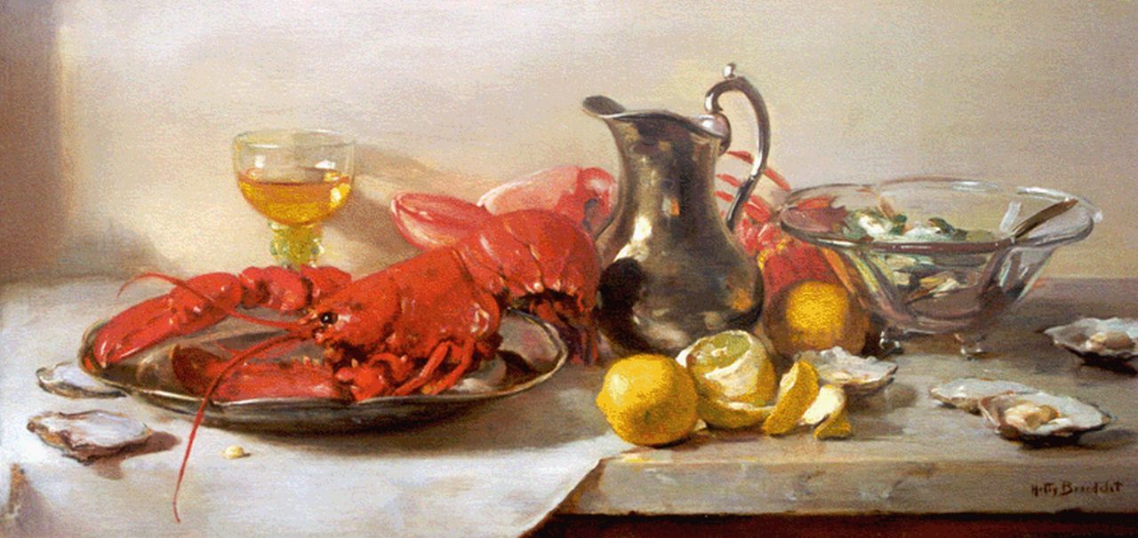 Hetty Broedelet-Henkes kunstwerk • schilderij • voorheen te koop Stilleven met kreeft en oesters