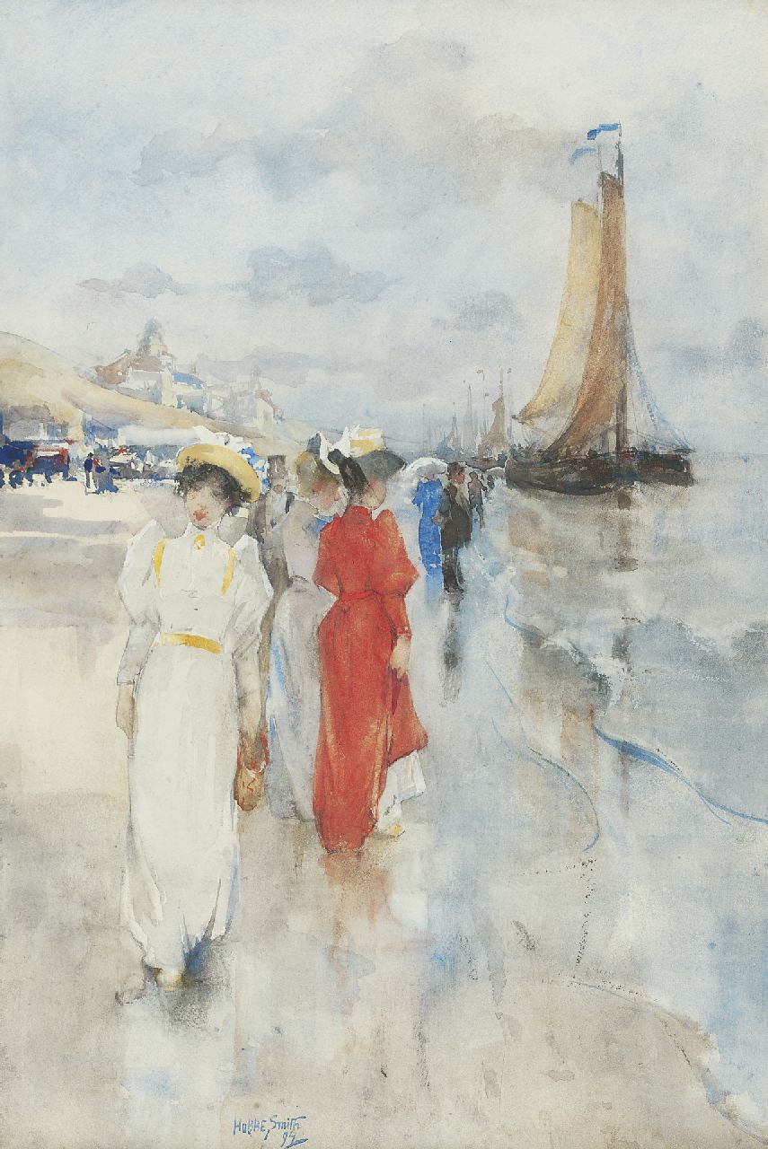 Smith H.  | Hobbe Smith, Elegante wandelaarsters op het strand van Scheveningen, aquarel op papier 45,9 x 30,4 cm, gesigneerd links van het midden. en gedateerd '94