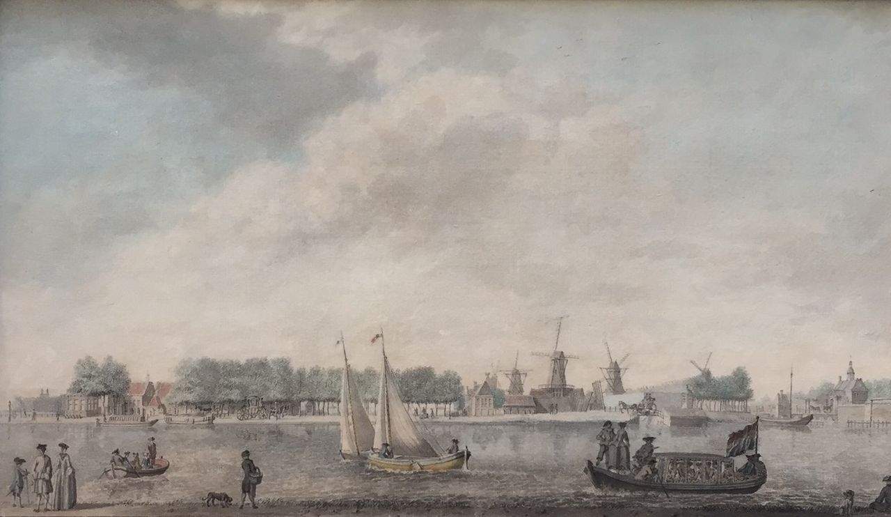Hollandse School, 18e eeuw kunstwerk • aquarel • tekening • te koop Gezicht op de Singelgracht bij Amsterdam met de Utrechtse Poort