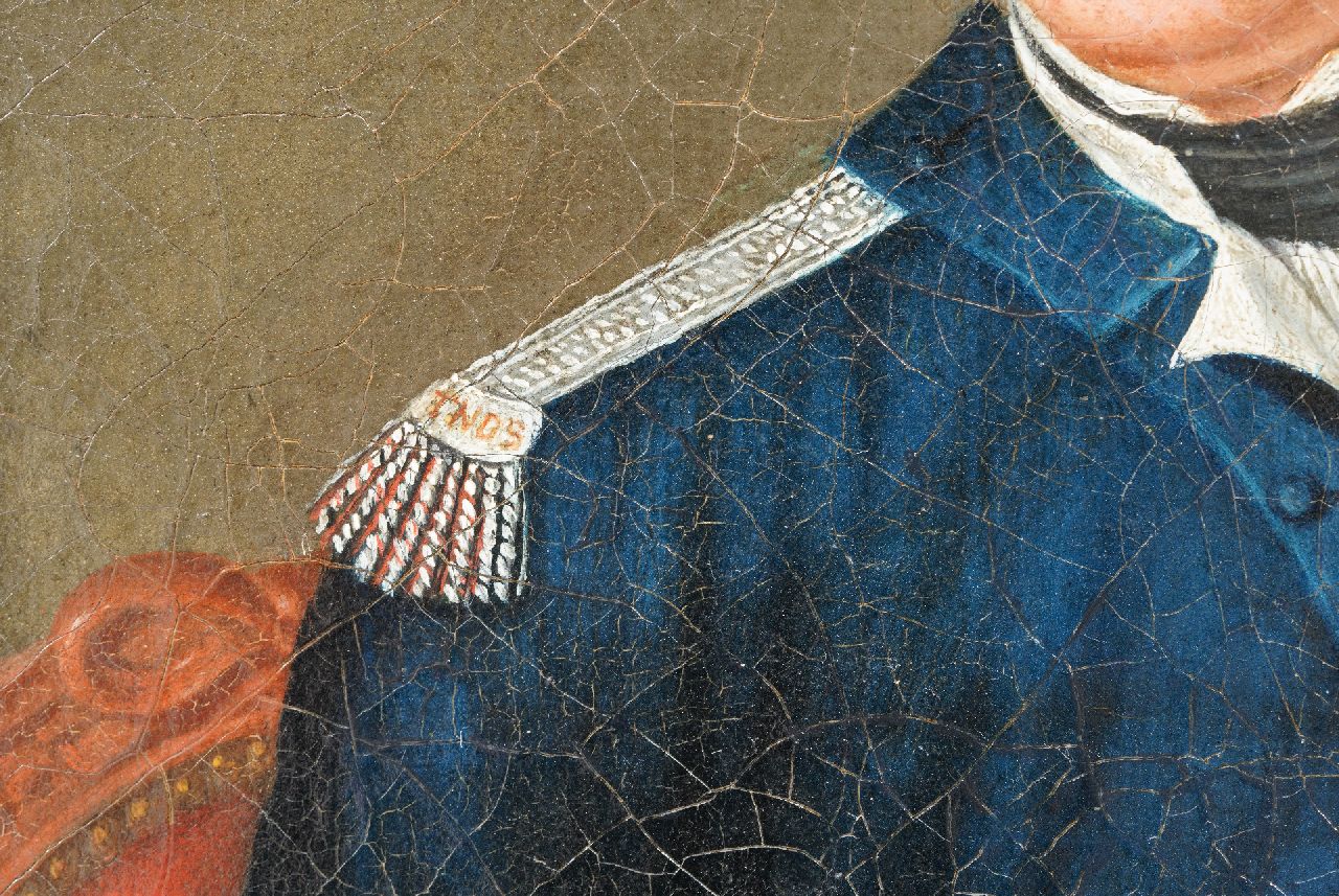 Tot op heden hebben wij de identiteit van de hier afgebeelde patriot nog niet kunnen vaststellen. Zeker is dat hij lid was van een van de Amsterdamse patriotse wapengenootschappen. Deze genootschappen speelden een belangrijke rol bij de terugkeer van een Hollandse vorst op de Nederlandse troon na het vertrek van Lodewijk Napoleon. Vermoedelijk was hij lid van het wapengenootschap Tot Nut der Schutterij. Het geweer met bajonet duidt op de rang van luitenant, vaandrig of sergeant. De prominent afgebeelde dwarsfluit kan er ook op duiden dat hij pijper was. De 18e-eeuwse compagnieën marcheerden met 2 trommelaars en een pijper.