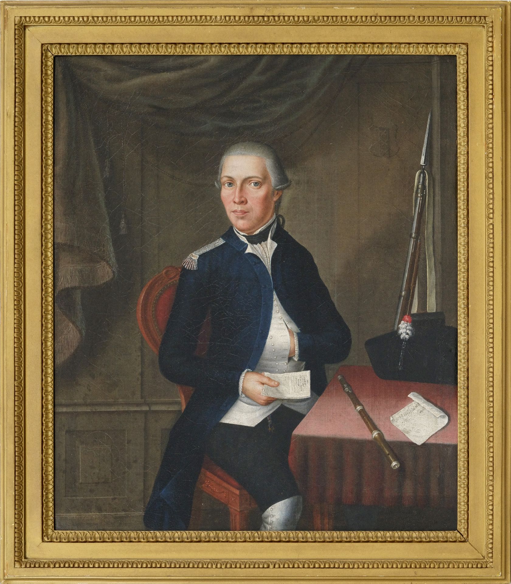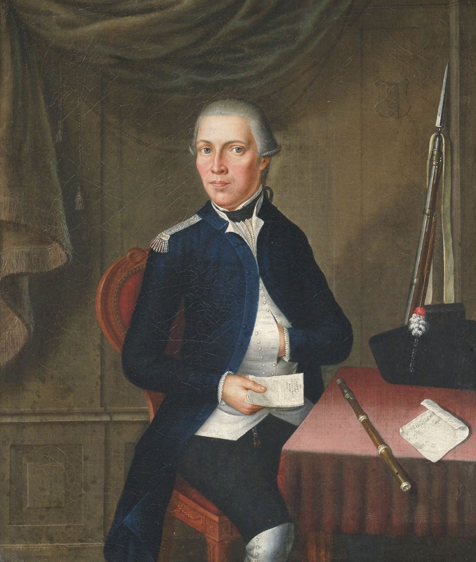 Tot op heden hebben wij de identiteit van de hier afgebeelde patriot nog niet kunnen vaststellen. Zeker is dat hij lid was van een van de Amsterdamse patriotse wapengenootschappen. Deze genootschappen speelden een belangrijke rol bij de terugkeer van een Hollandse vorst op de Nederlandse troon na het vertrek van Lodewijk Napoleon. Vermoedelijk was hij lid van het wapengenootschap Tot Nut der Schutterij. Het geweer met bajonet duidt op de rang van luitenant, vaandrig of sergeant. De prominent afgebeelde dwarsfluit kan er ook op duiden dat hij pijper was. De 18e-eeuwse compagnieën marcheerden met 2 trommelaars en een pijper.