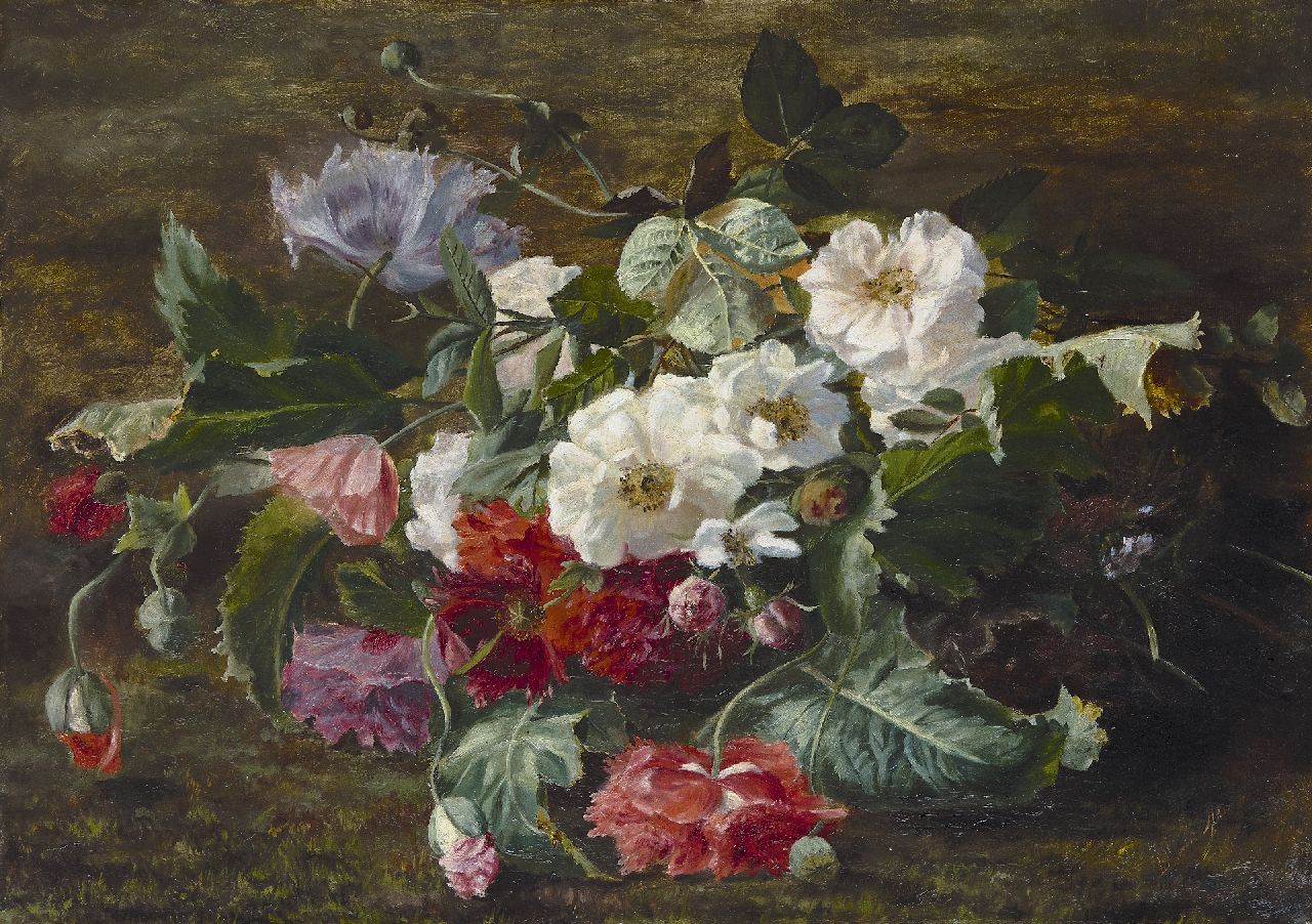 Hollandse School, 19e eeuw kunstwerk • schilderij • te koop Rozen en papavers op de bosgrond i.o.
