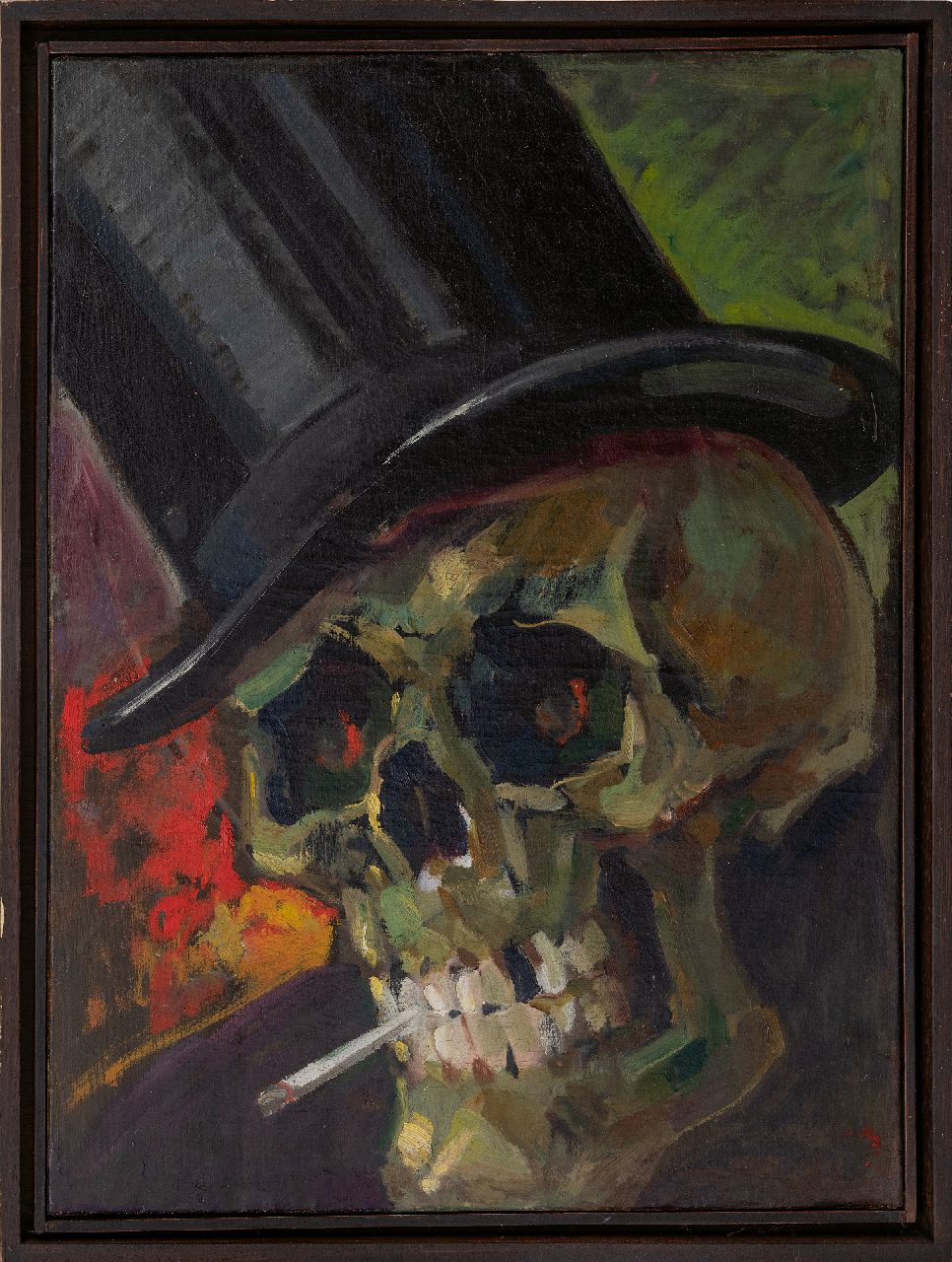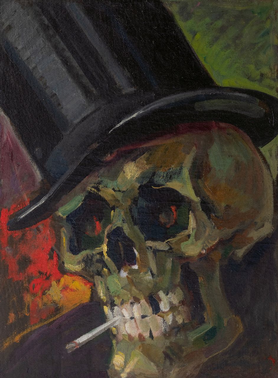 Hollandse School kunstwerk • schilderij • te koop Schedel met brandende sigaret en hoge hoed (memento mori)