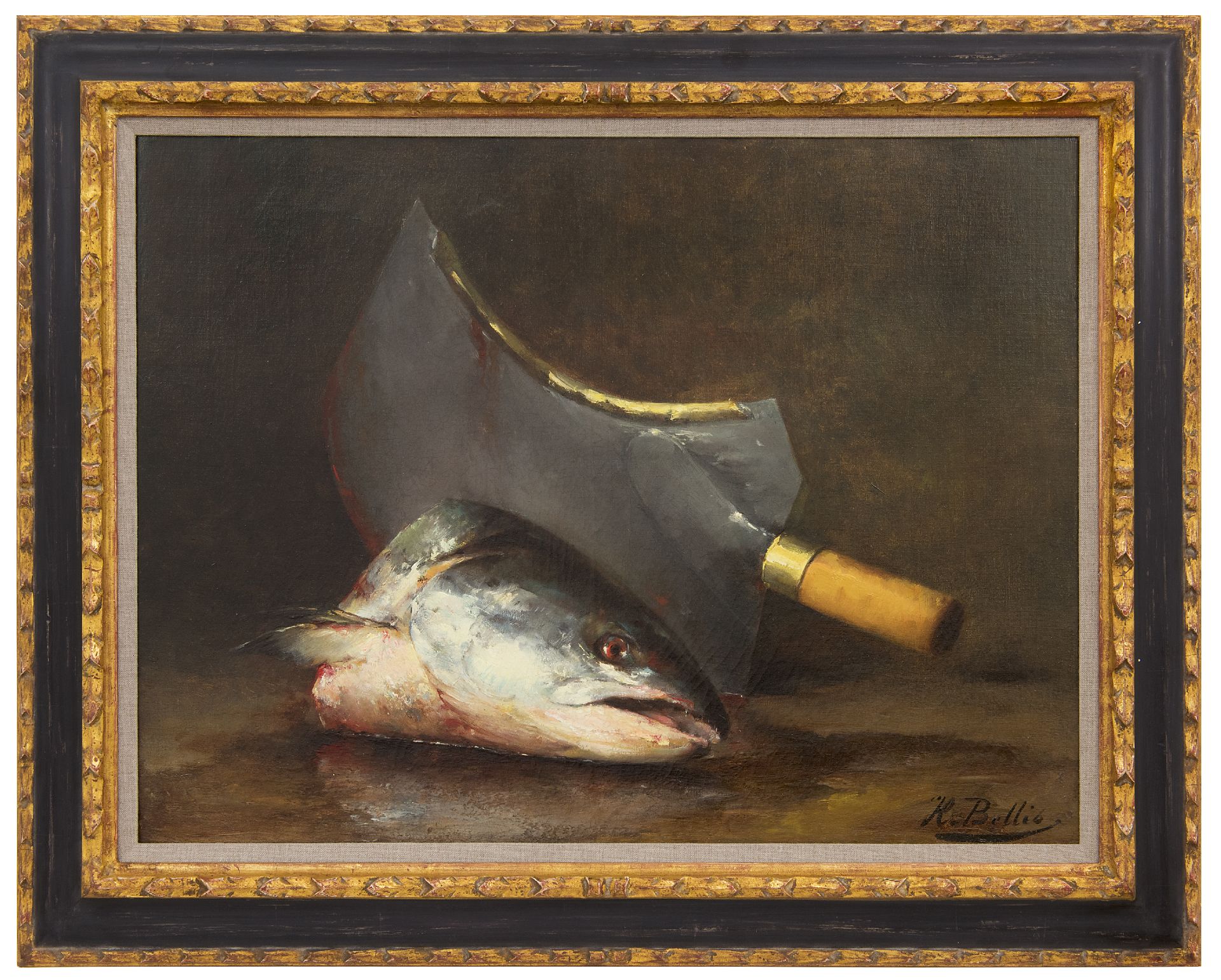 Hubert Bellis kunstwerk • schilderij • voorheen te koop Stilleven met vissenkop en hakmes