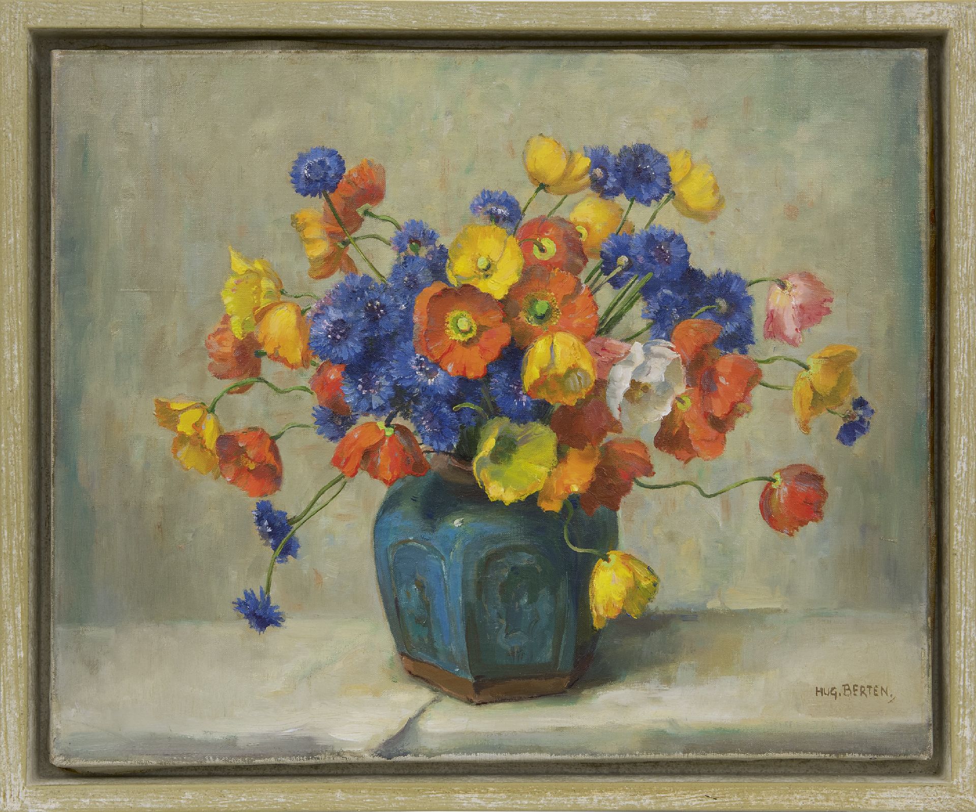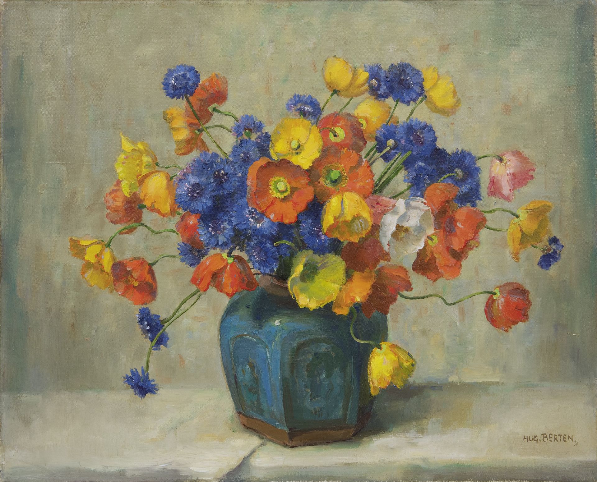 Hugo Berten kunstwerk • schilderij • voorheen te koop Klaprozen en korenbloemen in een gemberpot