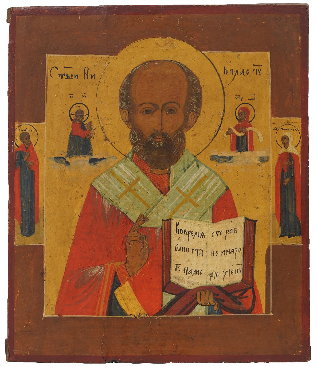 Ikoon kunstwerk • beeld • sculptuur • te koop Sint Nicolaas met beschemheiligen