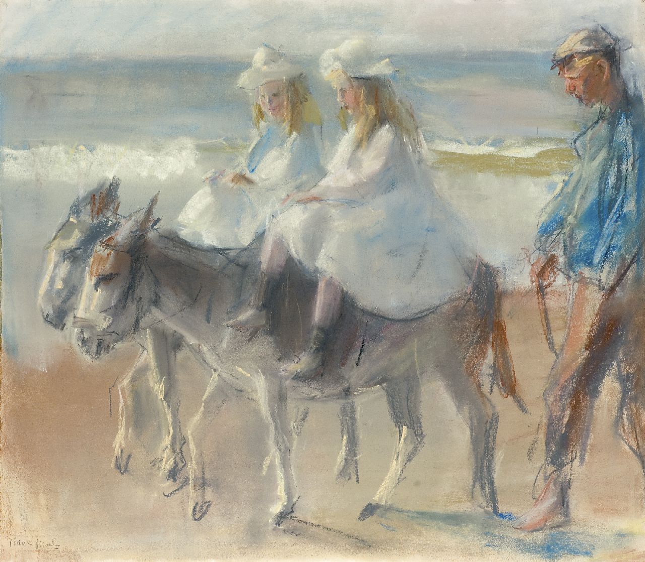 Isaac Israels kunstwerk • aquarel • tekening • voorheen te koop Ezeltje rijden op het strand van Scheveningen