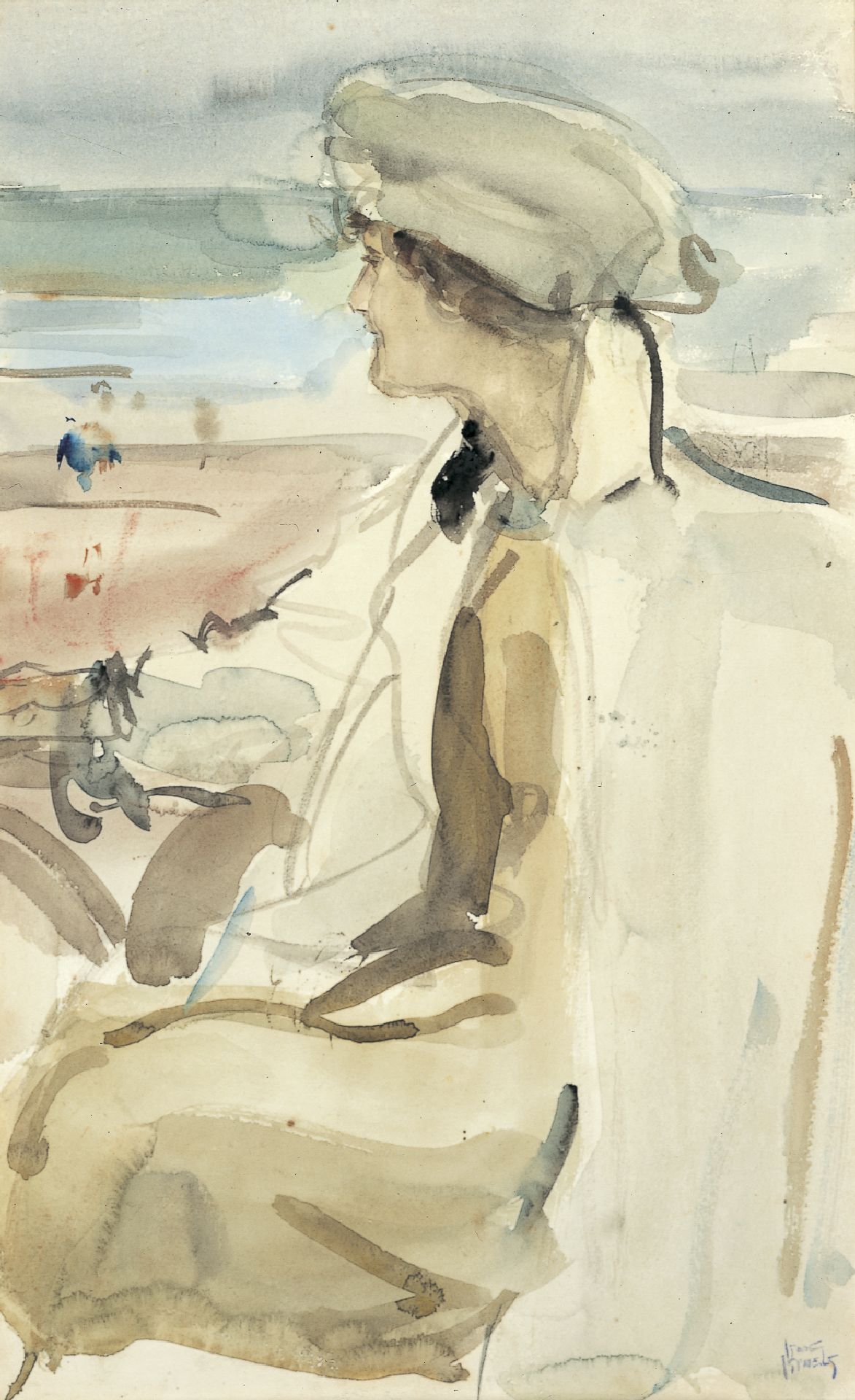 De bonte wereld van revue en theater boeide Isaac Israels zijn leven lang. Hij schetste vele artiesten, en bekende actrices en theaterpersoonlijkheden poseerden voor hem, zoals Fie Carelsen, Mata Hari en de hier afgebeelde zangeres en actrice Lola Cornero (1892-1980). Zittend op een Schevenings terras aan zee heeft hij haar snel en treffend in aquarel geportretteerd. Lola Cornero werd in Kiel, Duitsland geboren. Na enige omzwervingen door Europa kwam ze in 1915 naar Nederland, waar ze haar loopbaan begon als zangeres van internationale liederen. In die hoedanigheid werkte ze onder meer bij het cabaret van Jean Louis Pisuisse. De regisseur Maurits H. Binger ontdekte haar als actrice, met als resultaat dat zij in de periode 1916-1920 in tal van zijn stomme films speelde, meestal als dame uit betere kringen.