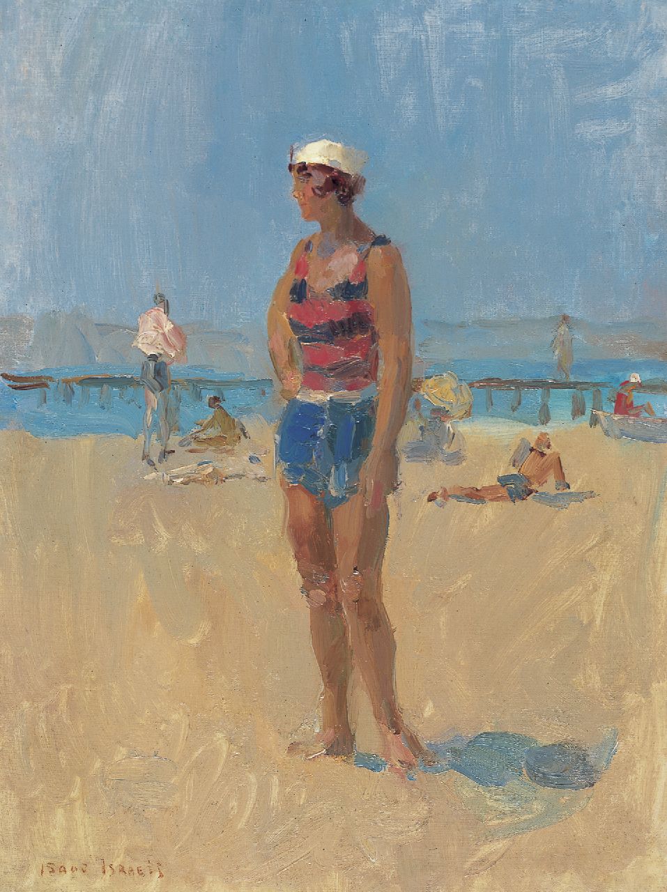 Isaac Israels, met G.H. Breitner de belangrijkste Amsterdamse Impressionist, ging als kleine jongen vaak met zijn vader Jozef Israels mee naar Scheveningen, maar pas vanaf 1895 zou hij er zelf schilderen en zouden strandgezichten een belangrijk deel van zijn oeuvre vormen. Isaac zag echter een heel ander Scheveningen dan zijn vader: geen bomschuiten, visservrouwen en nettenboetsters, maar mondaine baadsters in moderne badpakken, elegante dames in luchtig opwaaiende kleding en ezelrijdende meisjes in kleurige jurkjes, impressionistisch en levendig geschilderd en stralend van licht en kleur. In de jaren ‘20 en ‘30 schilderde Israels, behalve in Scheveningen, ook strandscènes in Italië en Frankrijk. In Aix-les-Bains, gelegen in de Franse Alpen aan het meer van Bourget, schilderde hij deze baadster, zelfbewust en zongebruind voor hem poserend in een modieus badtenue.