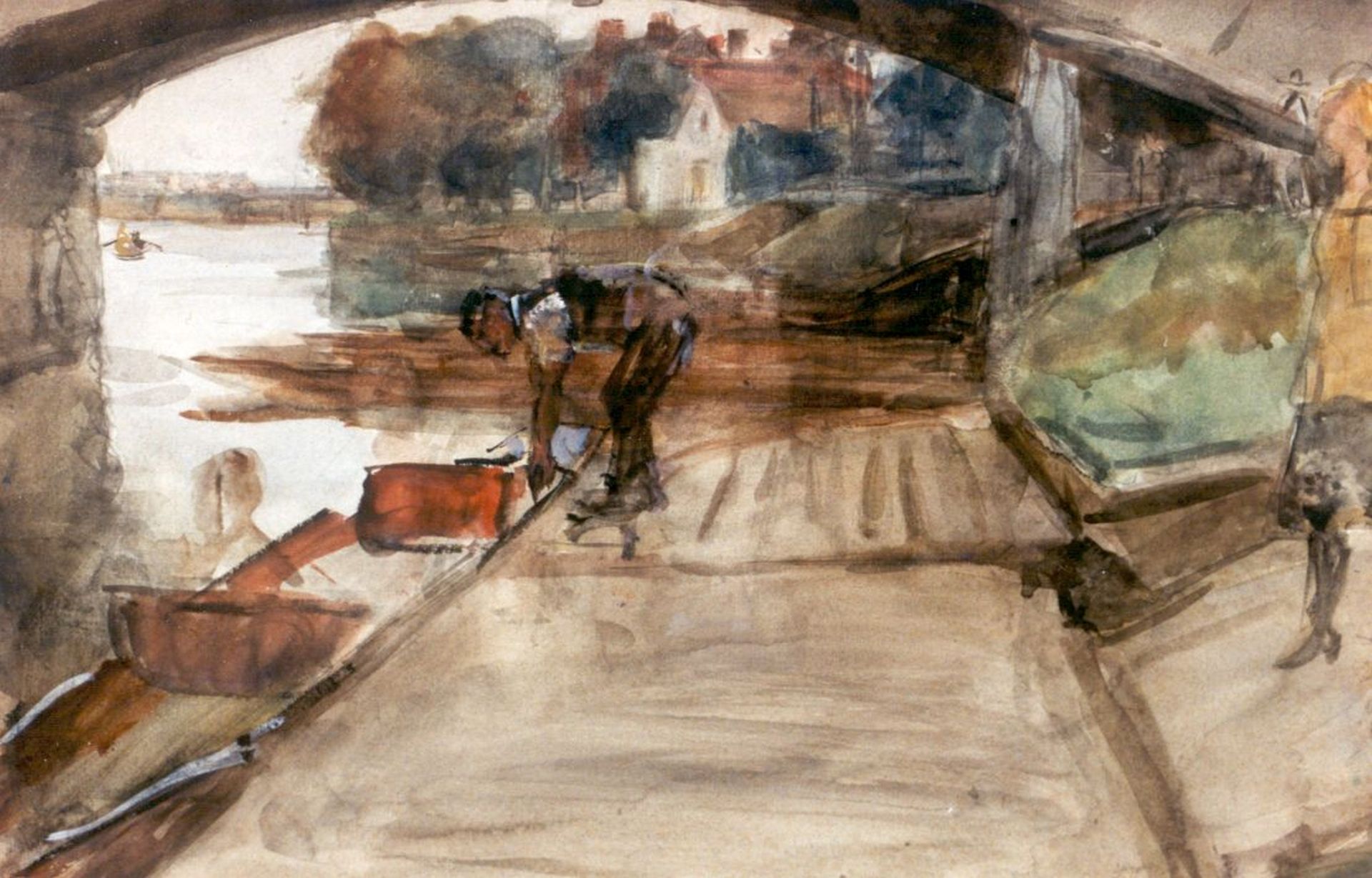 Isaac Israels kunstwerk • aquarel • tekening • voorheen te koop Man bij een roeiboot onder een brug over de Theems