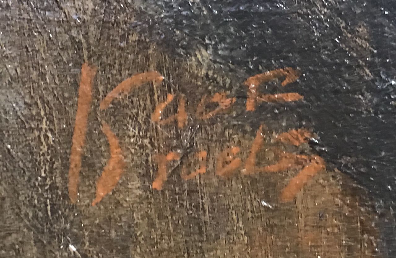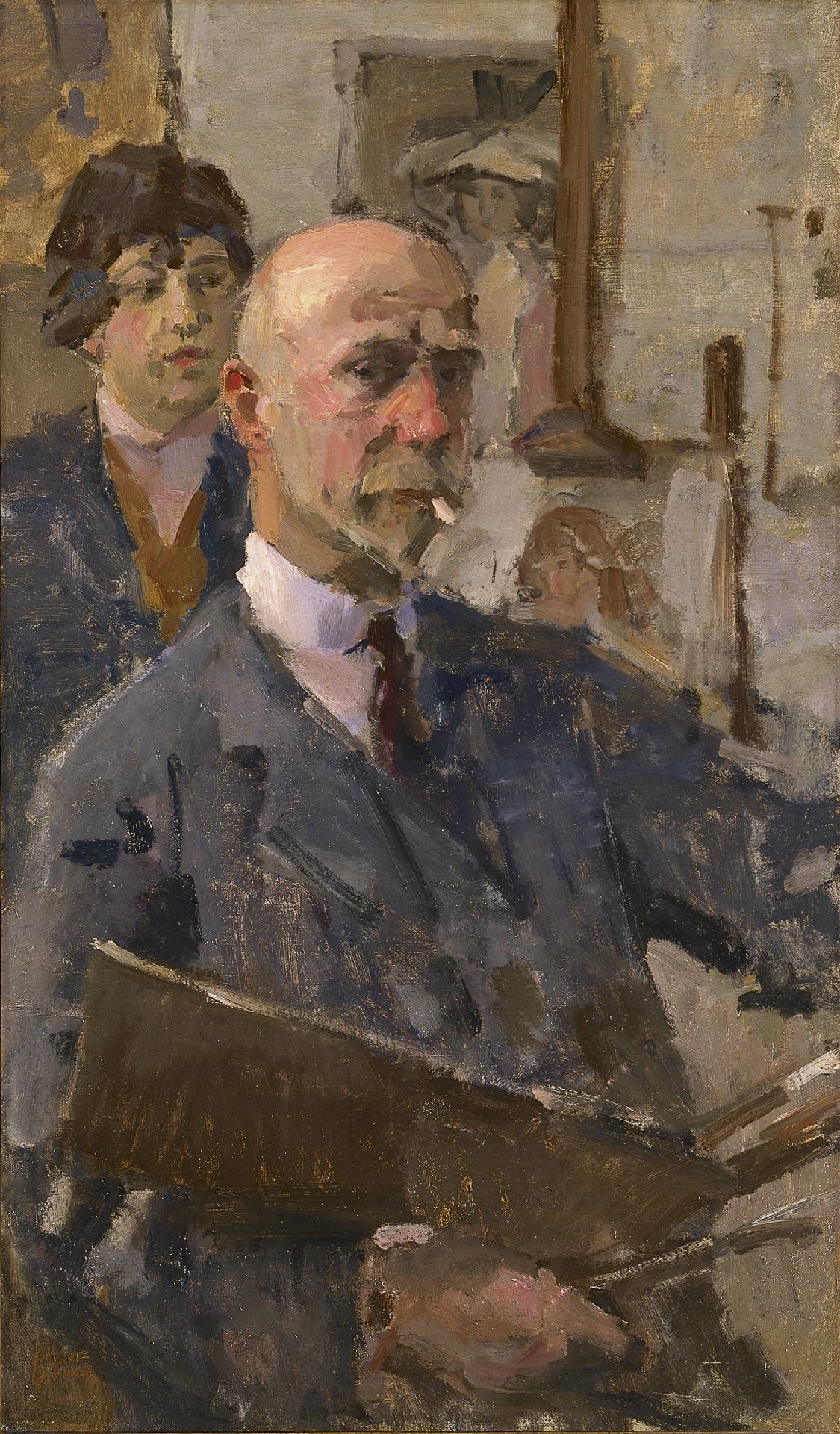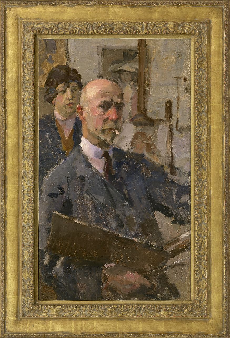 Dit importante zelfportret van de grote Nederlandse impressionist Isaac Israels is afkomstig uit de collectie Alvarez Corea te Parijs, die bevriend was met de schilder, en het rond 1920 direct van hem heeft verkregen. U ziet hier Israels' markante kop, met zijn eeuwige sigaretje, zelfbewust rechtop gezeten, met een directe blik naar de toeschouwer kijkend. Waarschijnlijk schilderde hij een portret van het model dat achter zijn rug kritisch toekijkt. Op de achtergrond zijn nog twee portretten en een schildersezel te zien. Israels, keurig met een wijnrood stropdasje, schilderde links en houdt met zijn rechterhand penselen en palet vast. Het behoeft geen betoog, dat de reputatie van deze vooraanstaande kunstenaar tot ver over de landsgrenzen reikt.