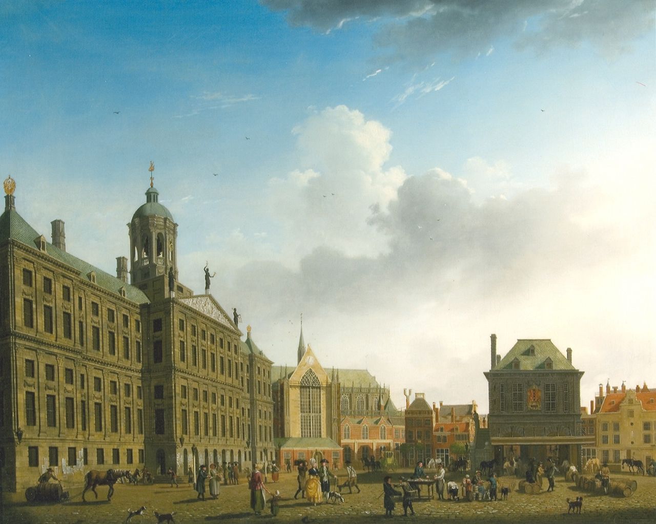 Isaac Ouwater kunstwerk • schilderij • voorheen te koop De Dam in Amsterdam met het Stadhuis en de Waag