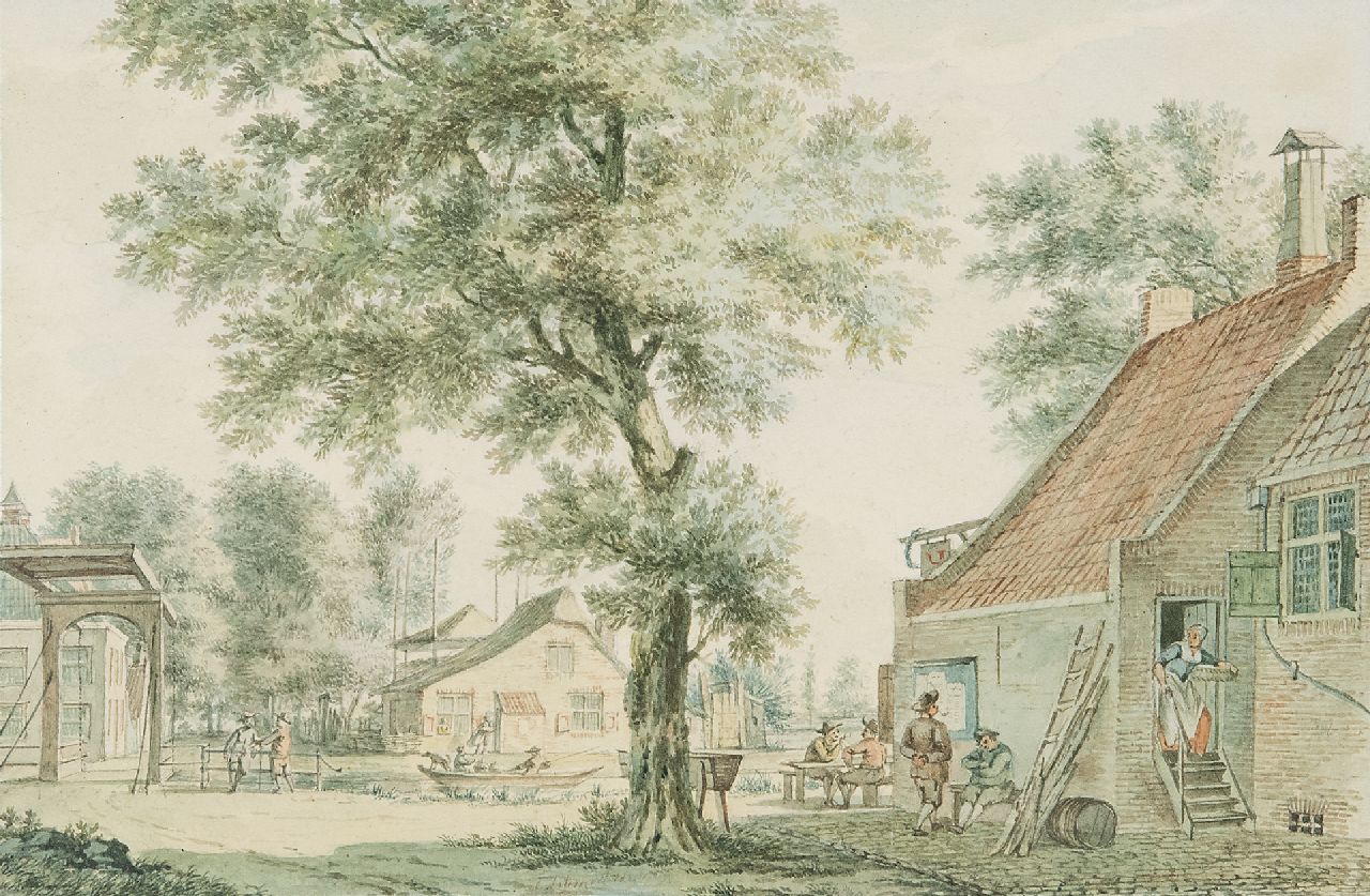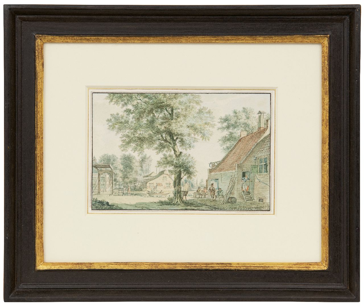Izaäk Schmidt kunstwerk • aquarel • tekening • te koop Dorpsgezicht met figuren bij een herberg