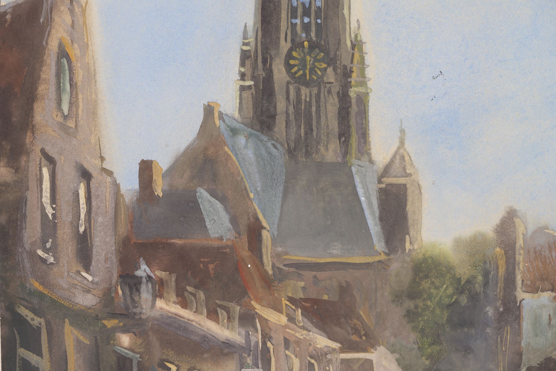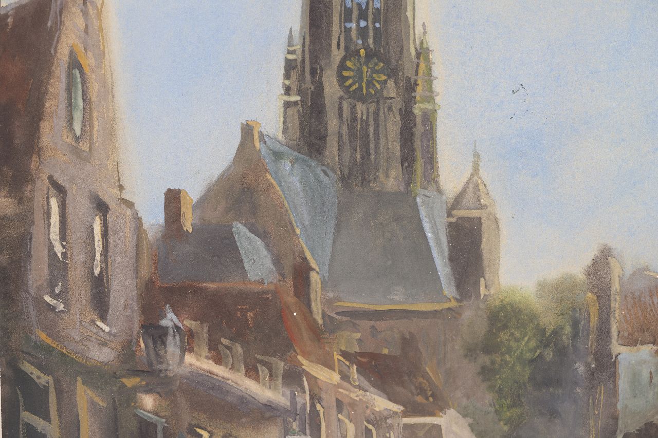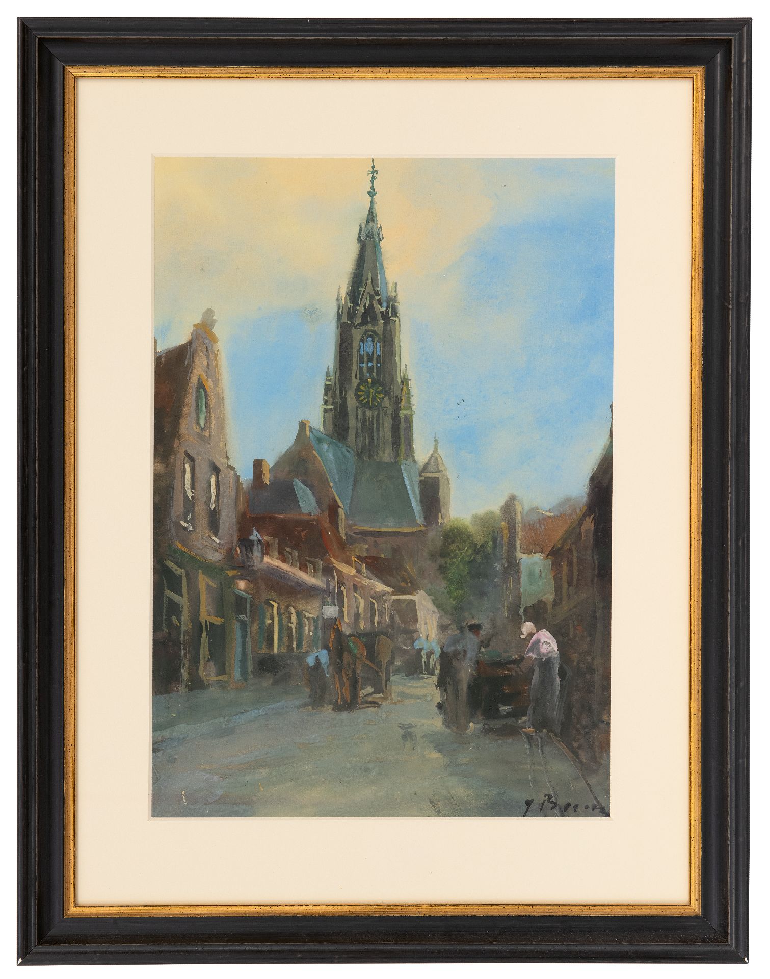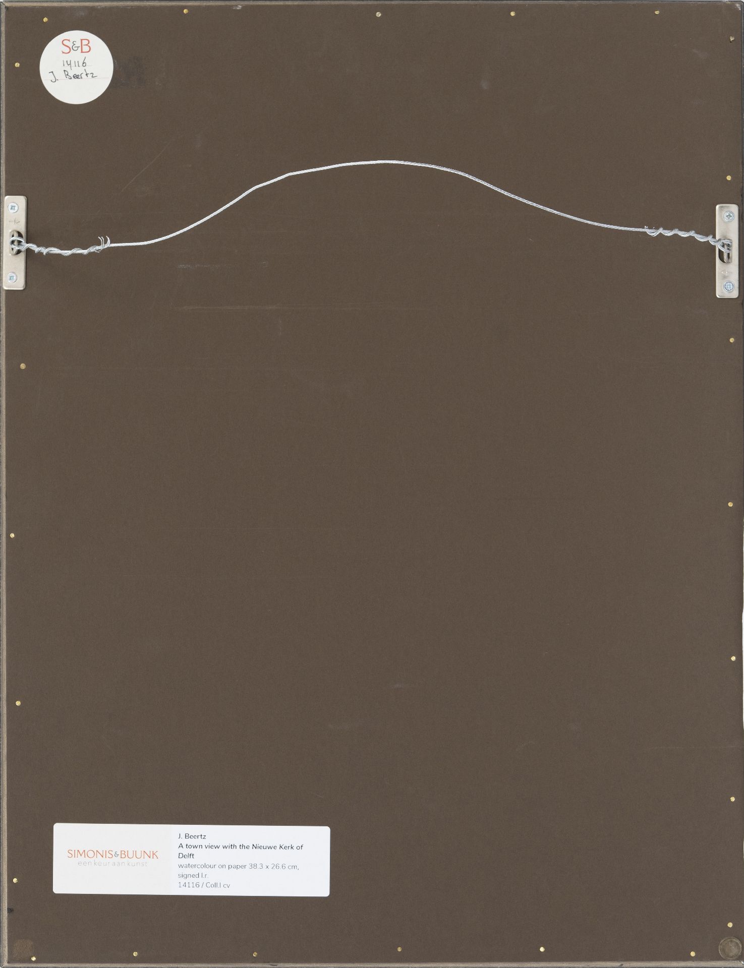 J. Beertz kunstwerk • aquarel • tekening • te koop Stadsgezicht met de Nieuwe Kerk van Delft