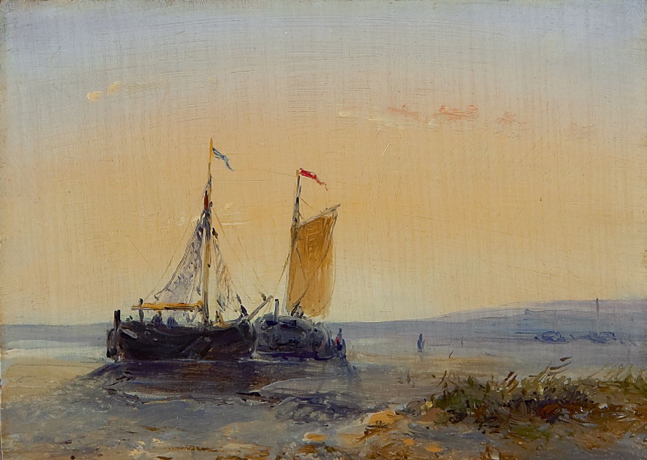 J.G. Hans kunstwerk • schilderij • voorheen te koop Twee bomschuiten op het strand bij zonsondergang