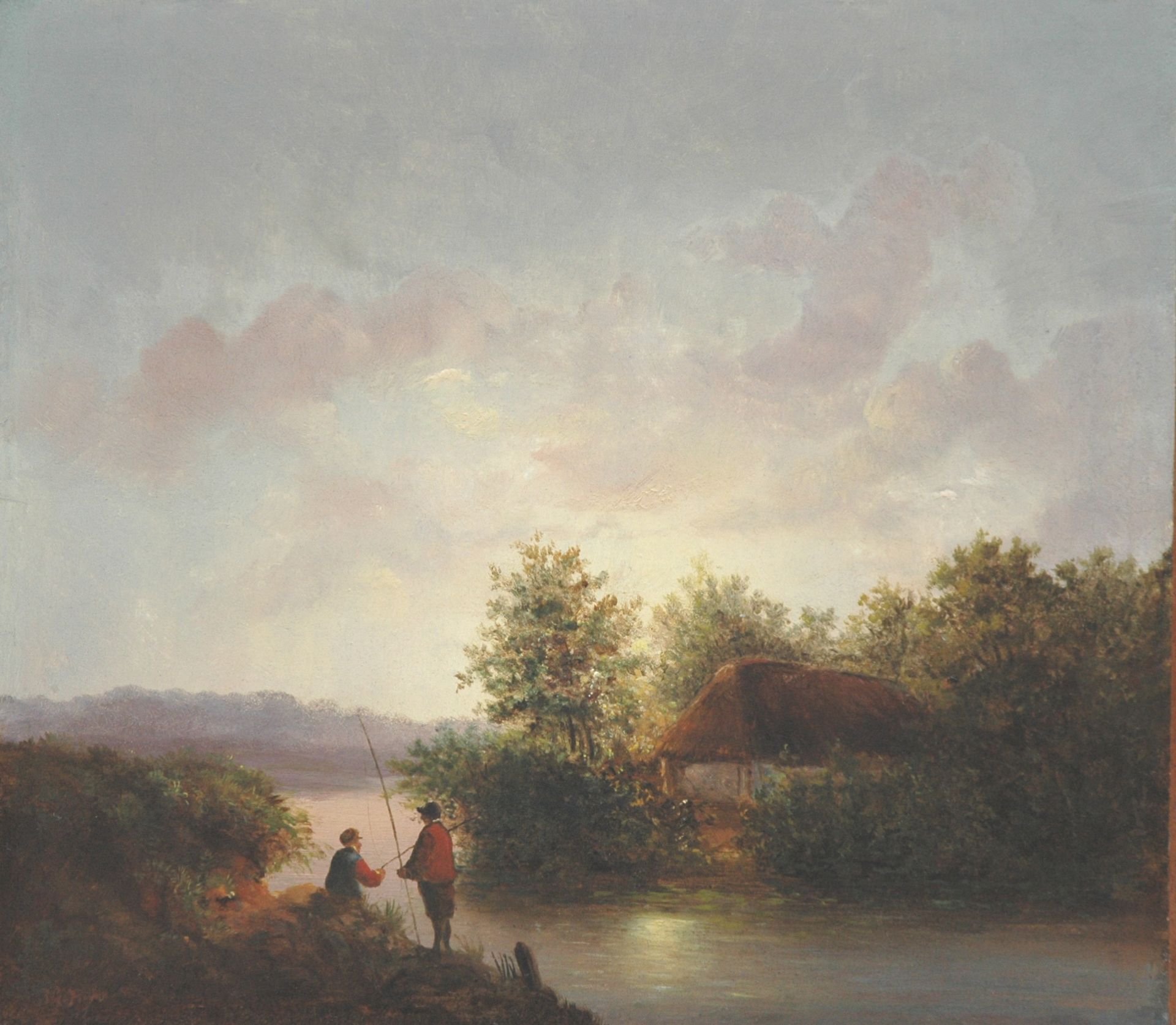 J.G. Hans kunstwerk • schilderij • voorheen te koop Vissers in een rivierlandschap bij ondergaande zon