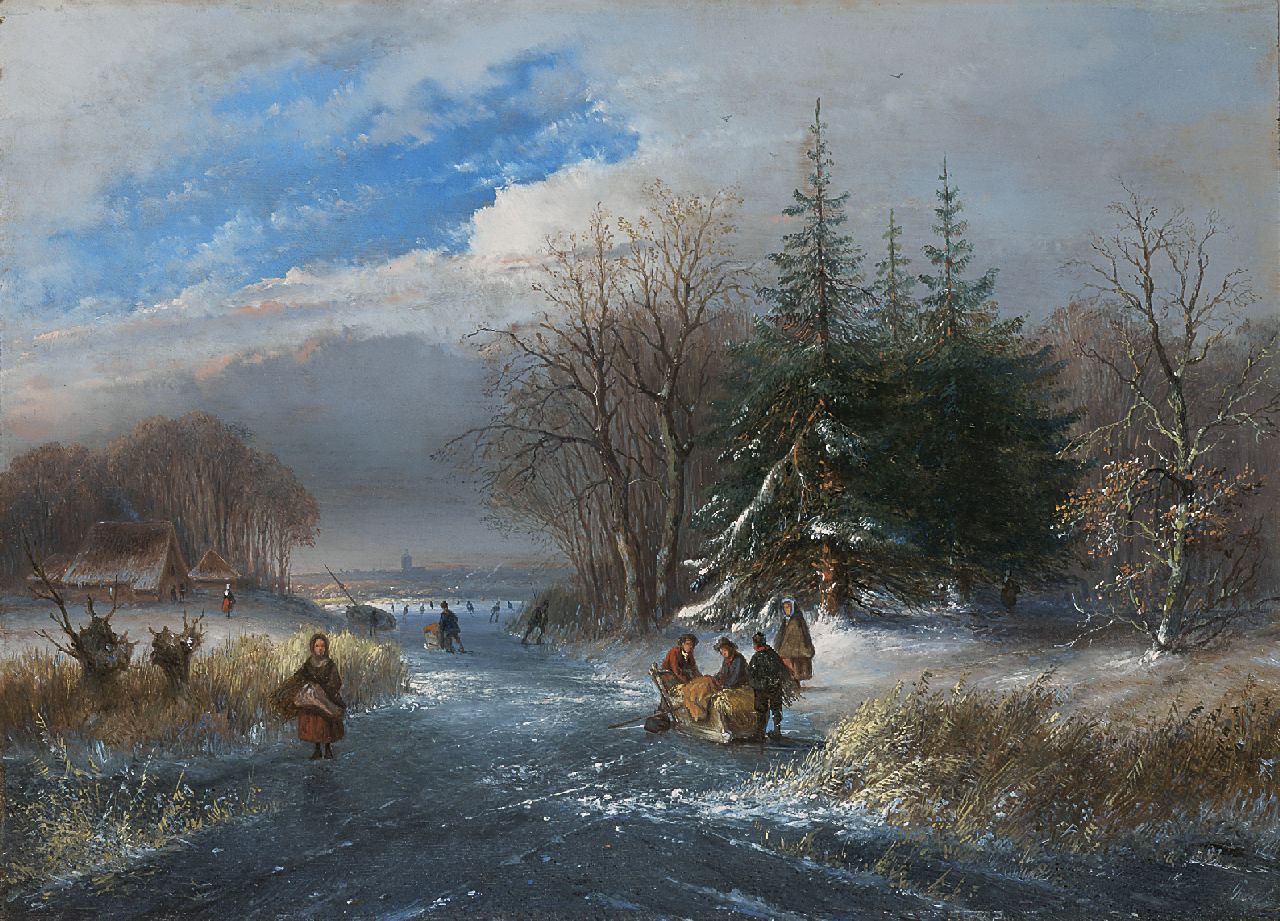 J.G. Hans kunstwerk • schilderij • voorheen te koop Winterlandschap met schaatsers, duwslee en houtsprokkelaarster