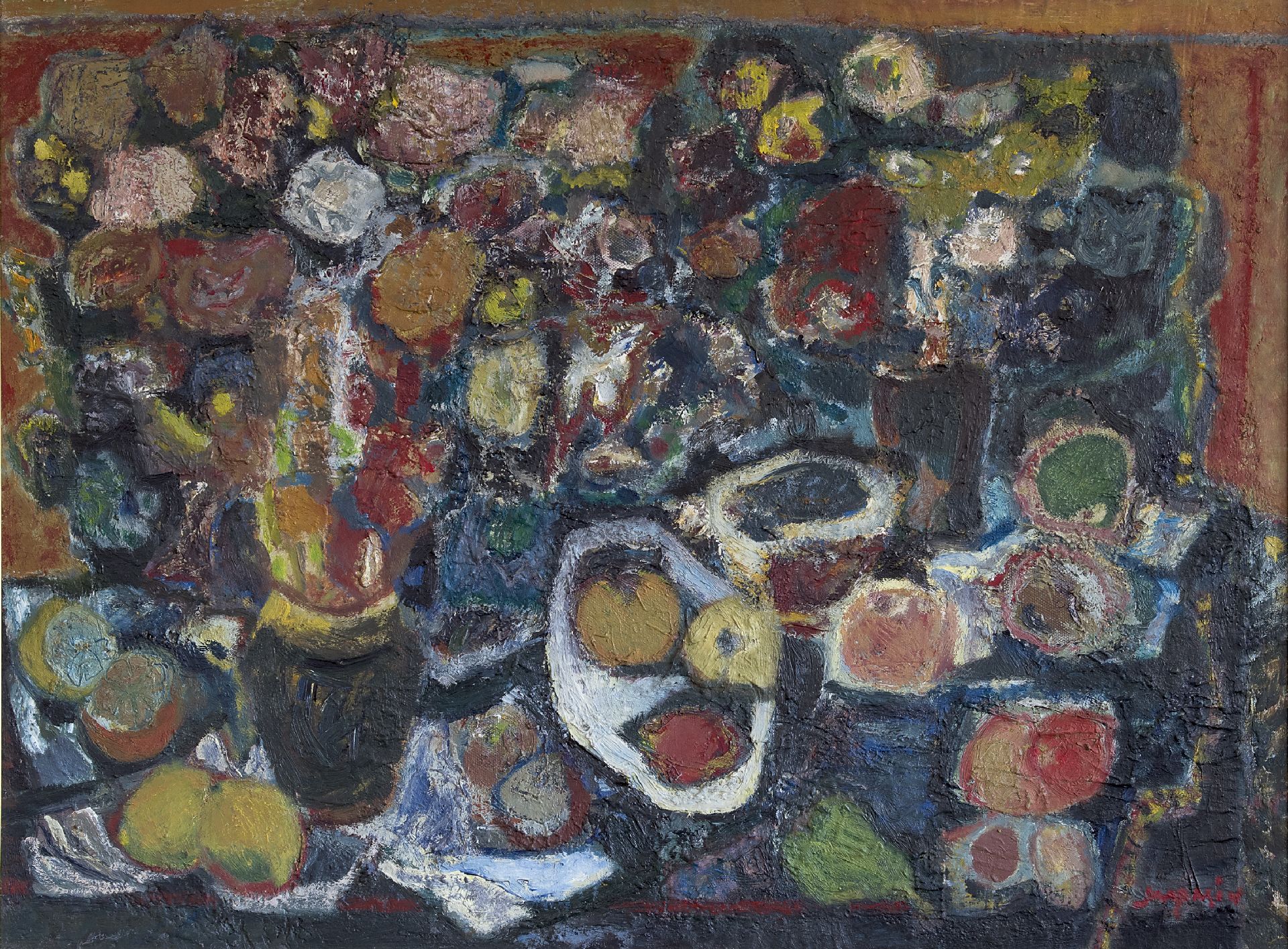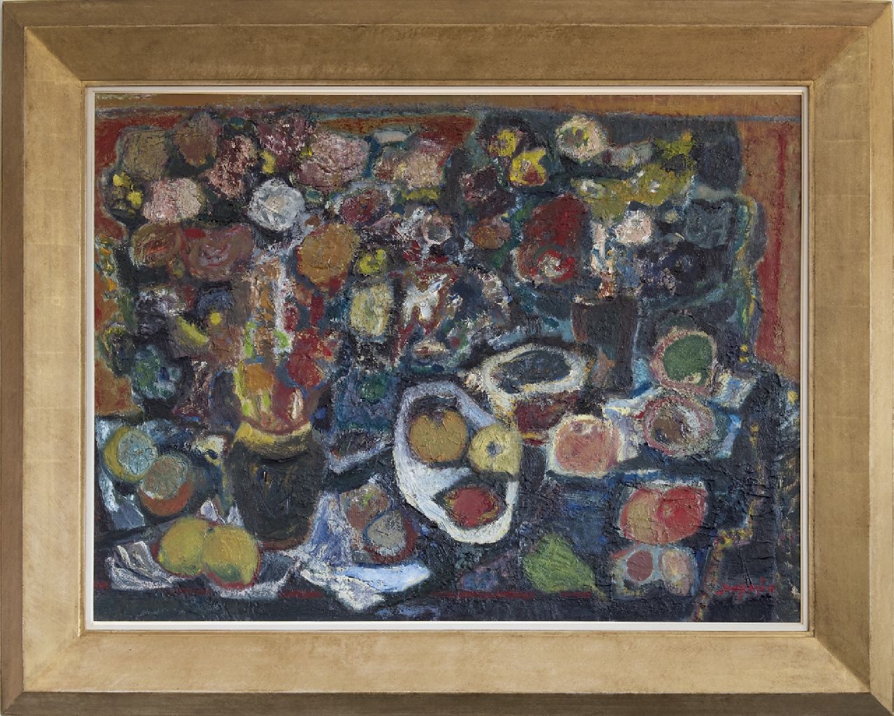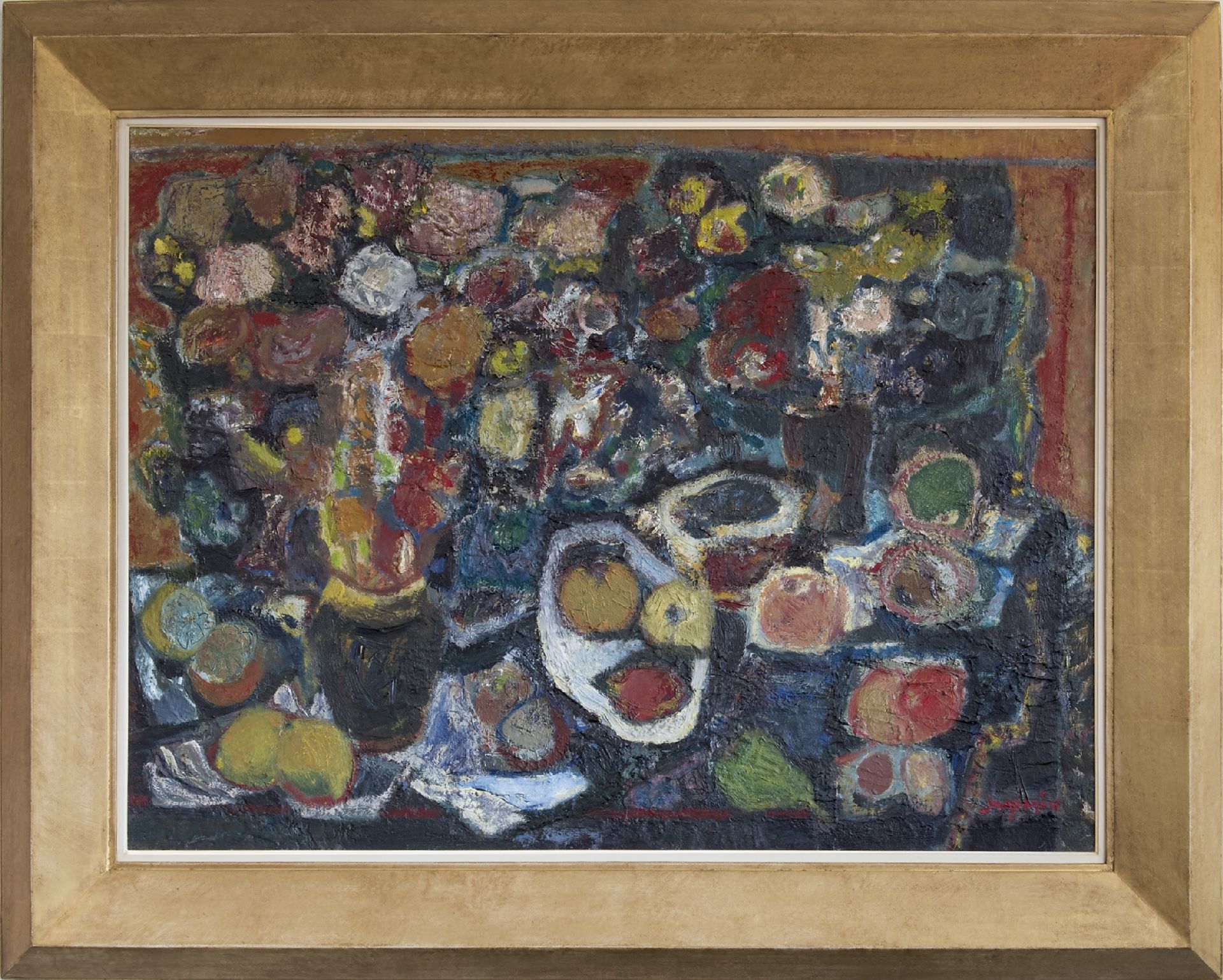 Jaap Min kunstwerk • schilderij • voorheen te koop Stilleven met fruit en bloemen