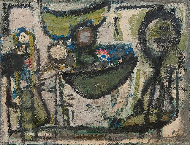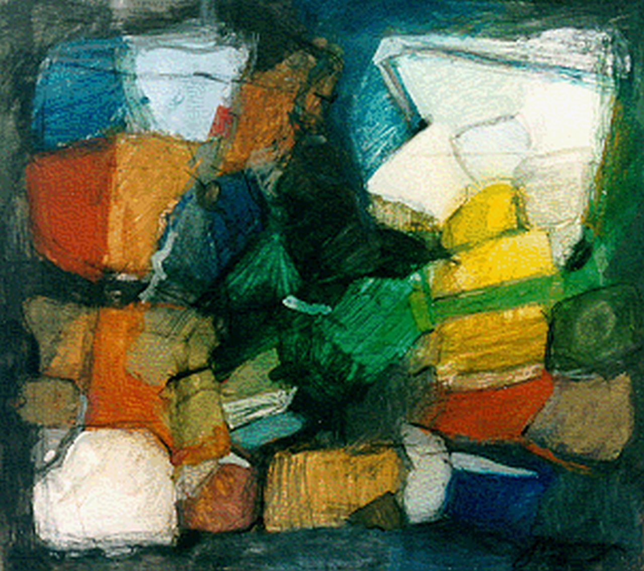 De Haagse schilder Jaap Nanninga behoorde tot de schilders die pas na de 2e wereldoorlog de stap maakten van figuratief naar abstract. Van invloed op zijn ontwikkeling was o.a. het abstracte werk van Geer van Velde, die hij in 1946 in Zuid-Frankrijk ontmoette. Nanninga bouwde zijn composities op uit vormen die hij intuïtief op het doek zette.