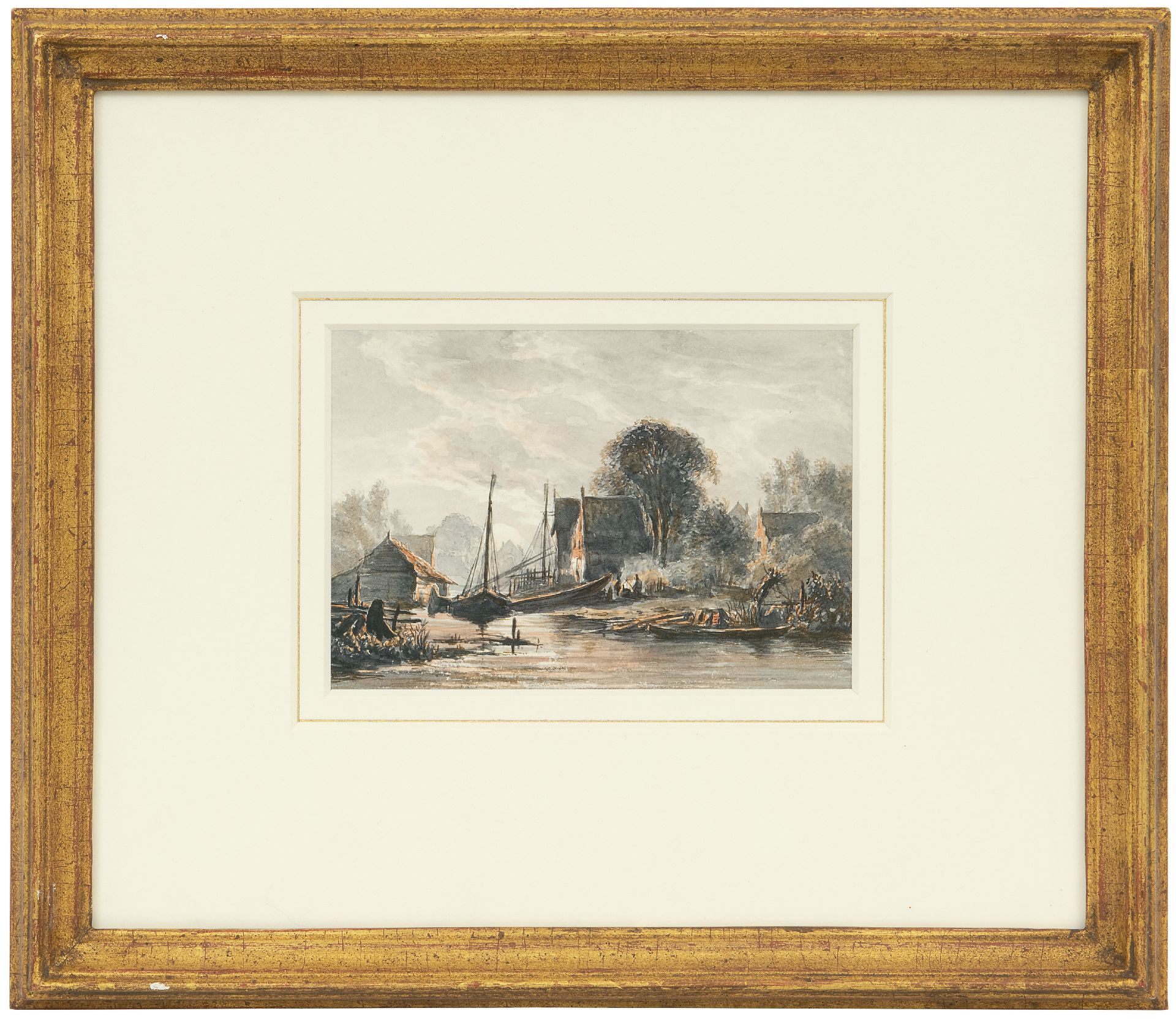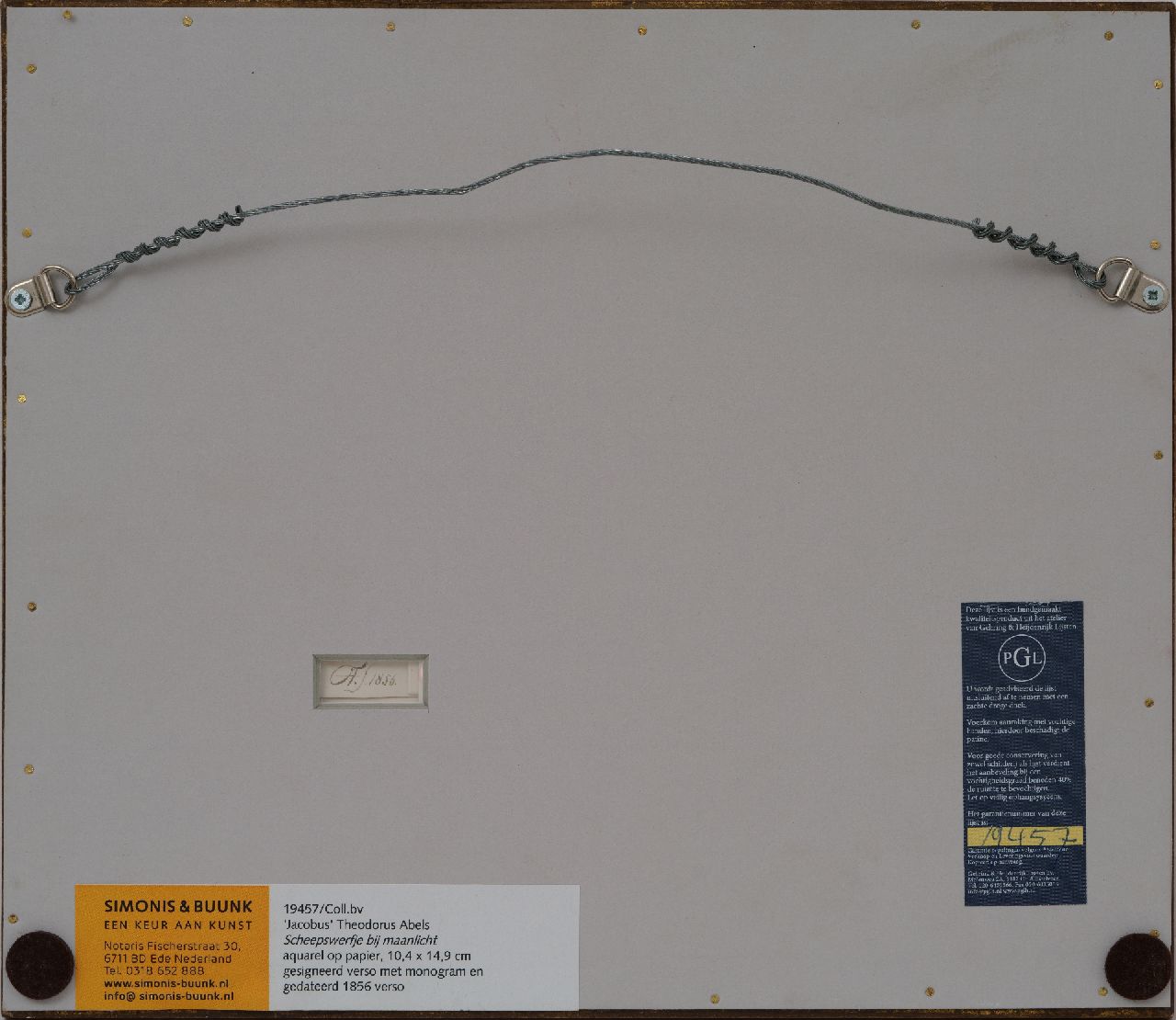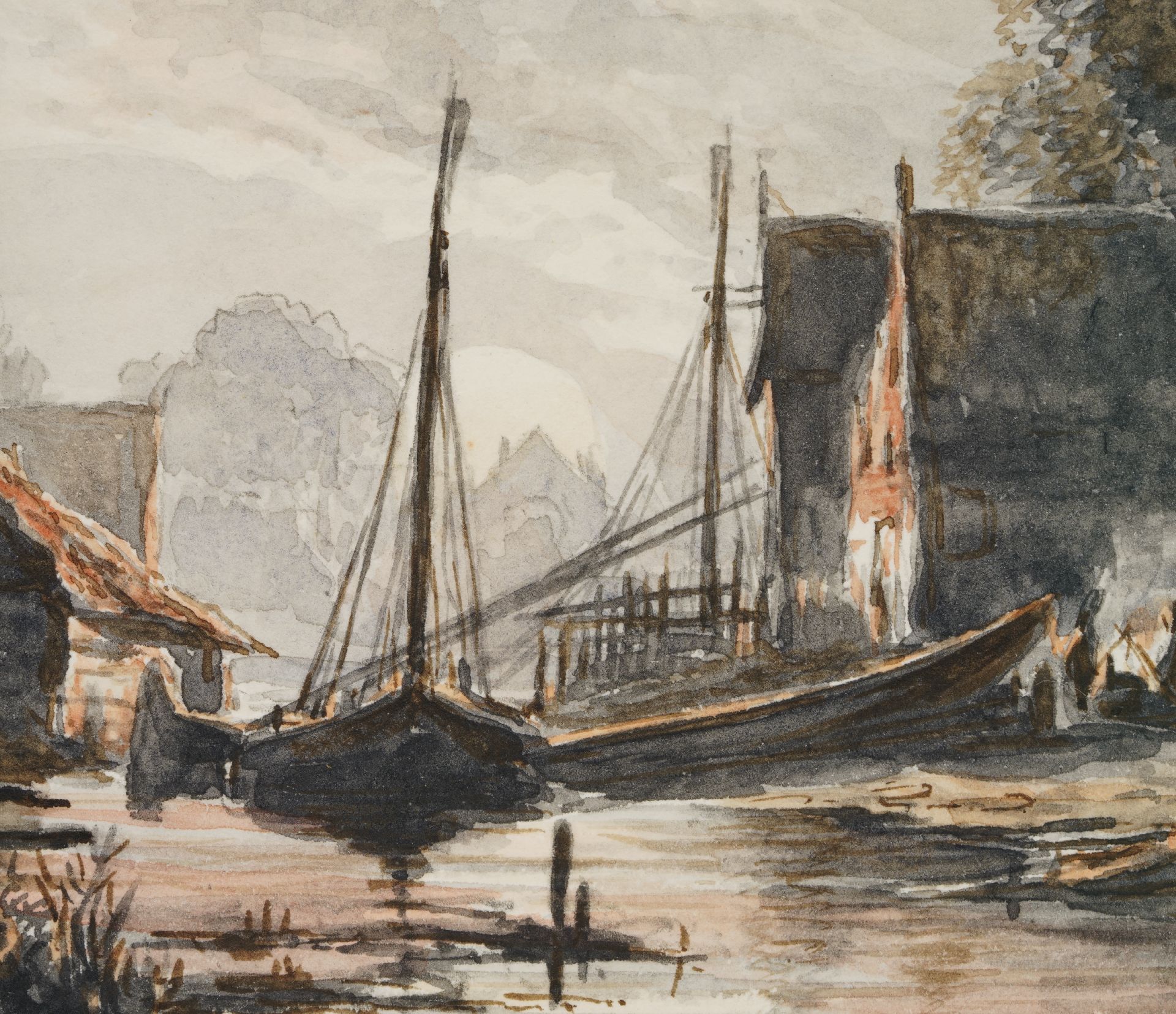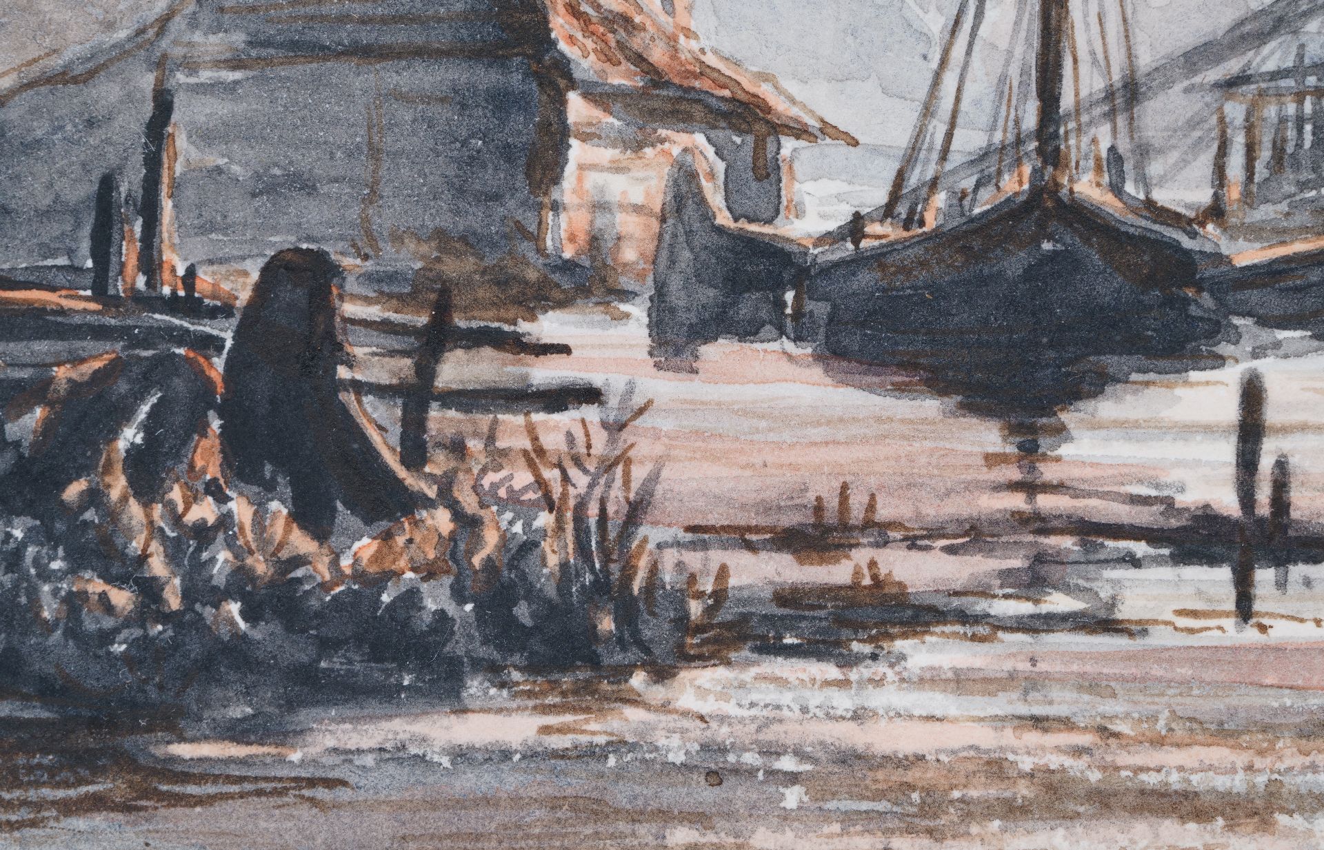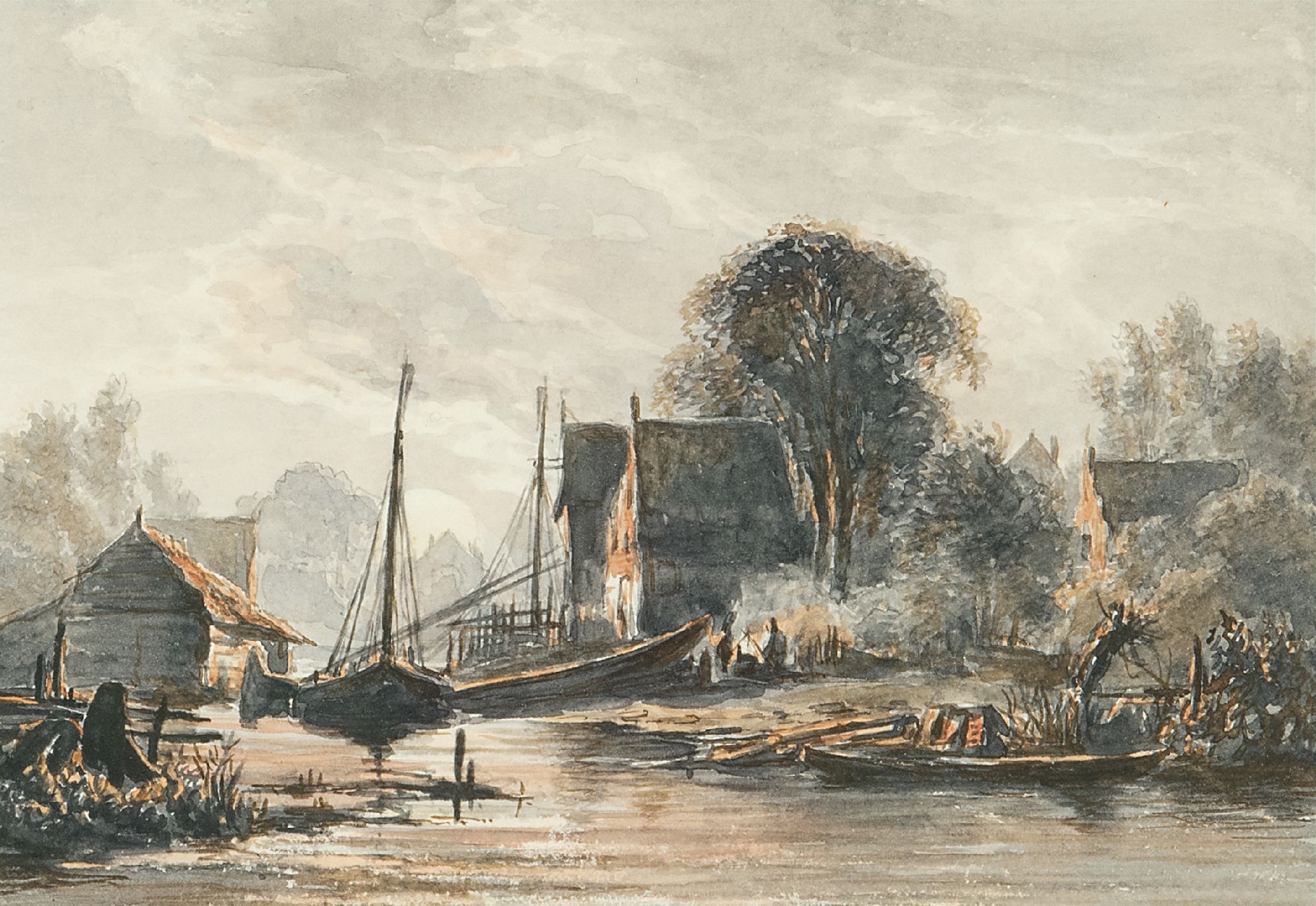 Jacob Abels kunstwerk • aquarel • tekening • voorheen te koop Scheepswerfje bij maanlicht