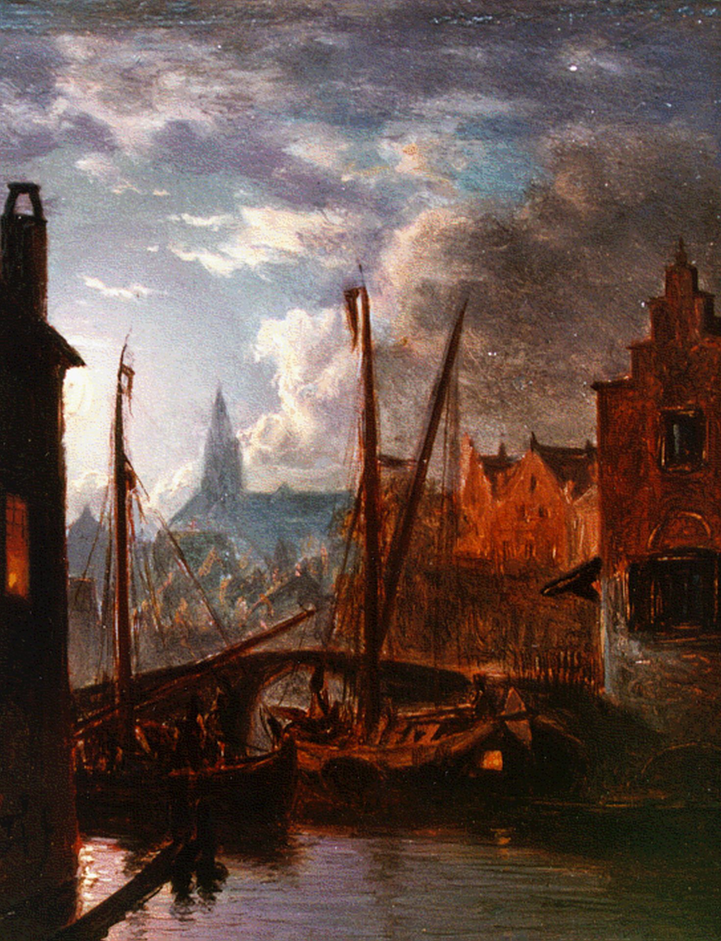 Jacob Abels kunstwerk • schilderij • voorheen te koop Aangemeerde zeilboten bij maanlicht