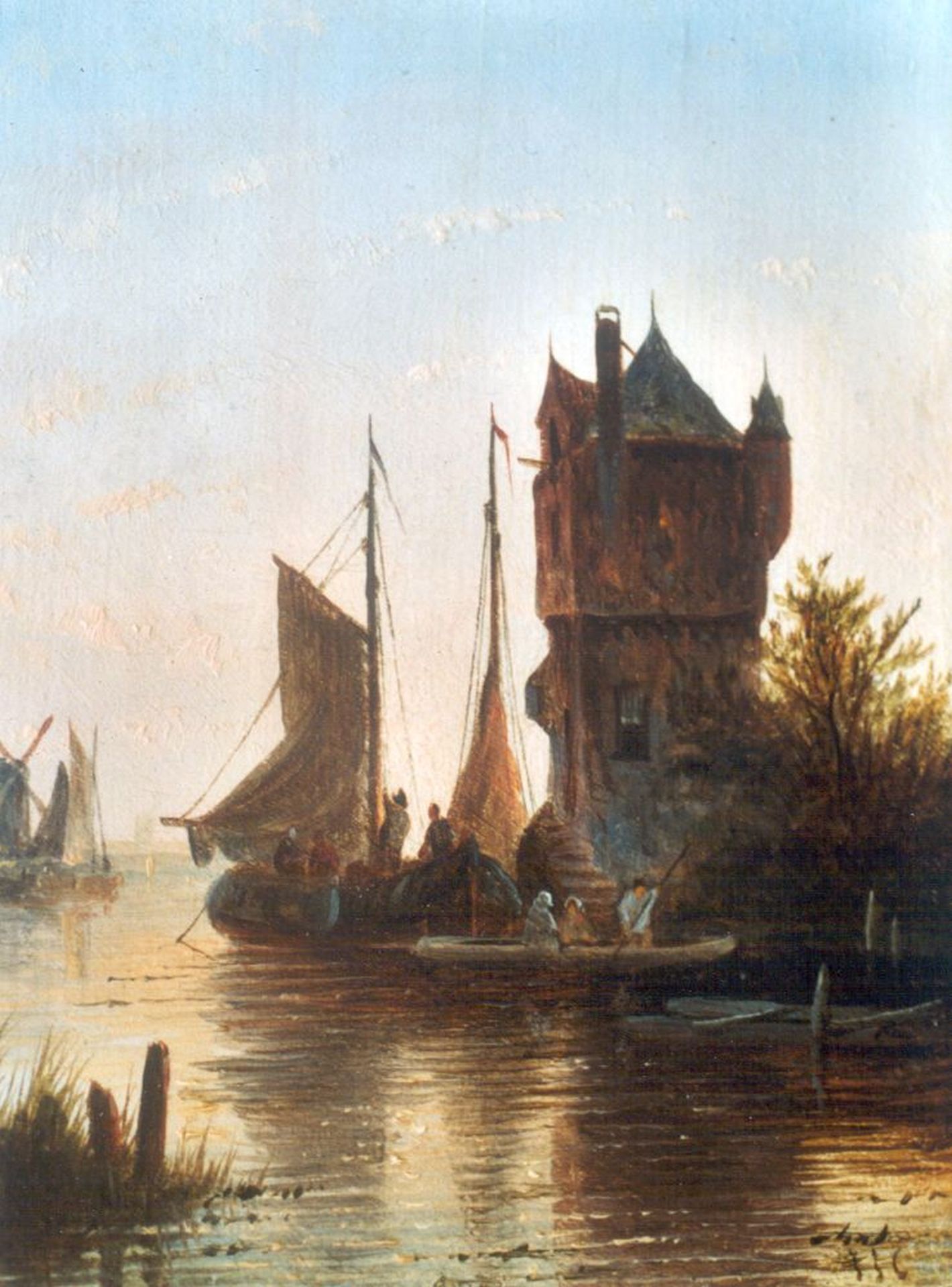 Jacob Jan Coenraad Spohler kunstwerk • schilderij • voorheen te koop Afgemeerde platbodems bij een toren
