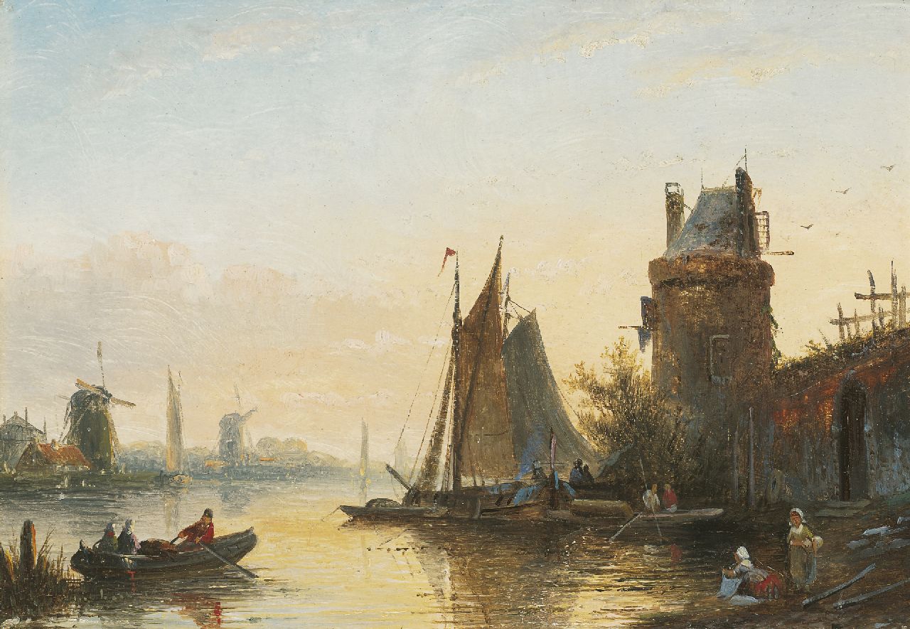 Jacob Jan Coenraad Spohler kunstwerk • schilderij • voorheen te koop Bedrijvigheid op een zomerse rivier (alleen tezamen met 11165)