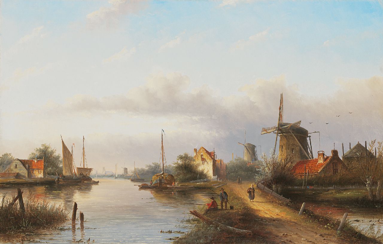 Jacob Jan Coenraad Spohler kunstwerk • schilderij • voorheen te koop Hollands riviergezicht met molens en twee hengelaars