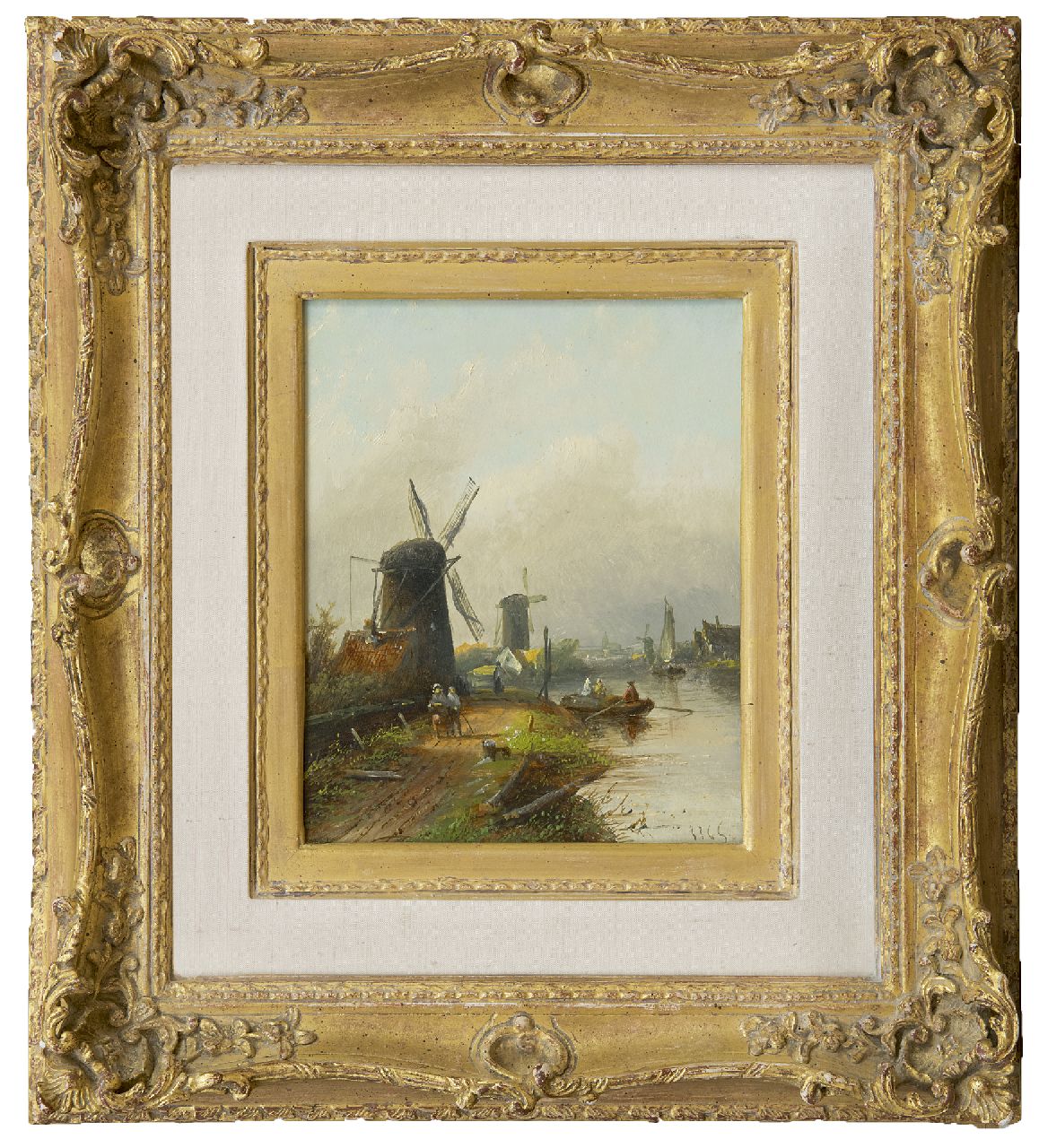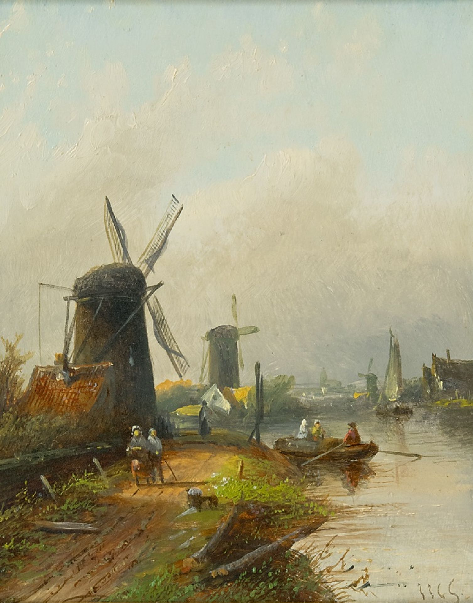 Jacob Jan Coenraad Spohler kunstwerk • schilderij • voorheen te koop Riviergezicht met molens, in de zomer