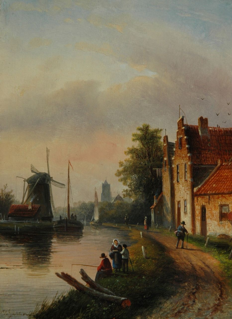 Jacob Jan Coenraad Spohler kunstwerk • schilderij • voorheen te koop Riviergezicht met zeilschepen en molen