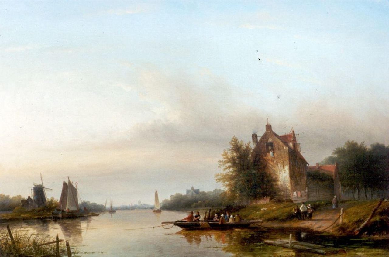 Jacob Jan Coenraad Spohler kunstwerk • schilderij • voorheen te koop Rivierlandschap met voetveer