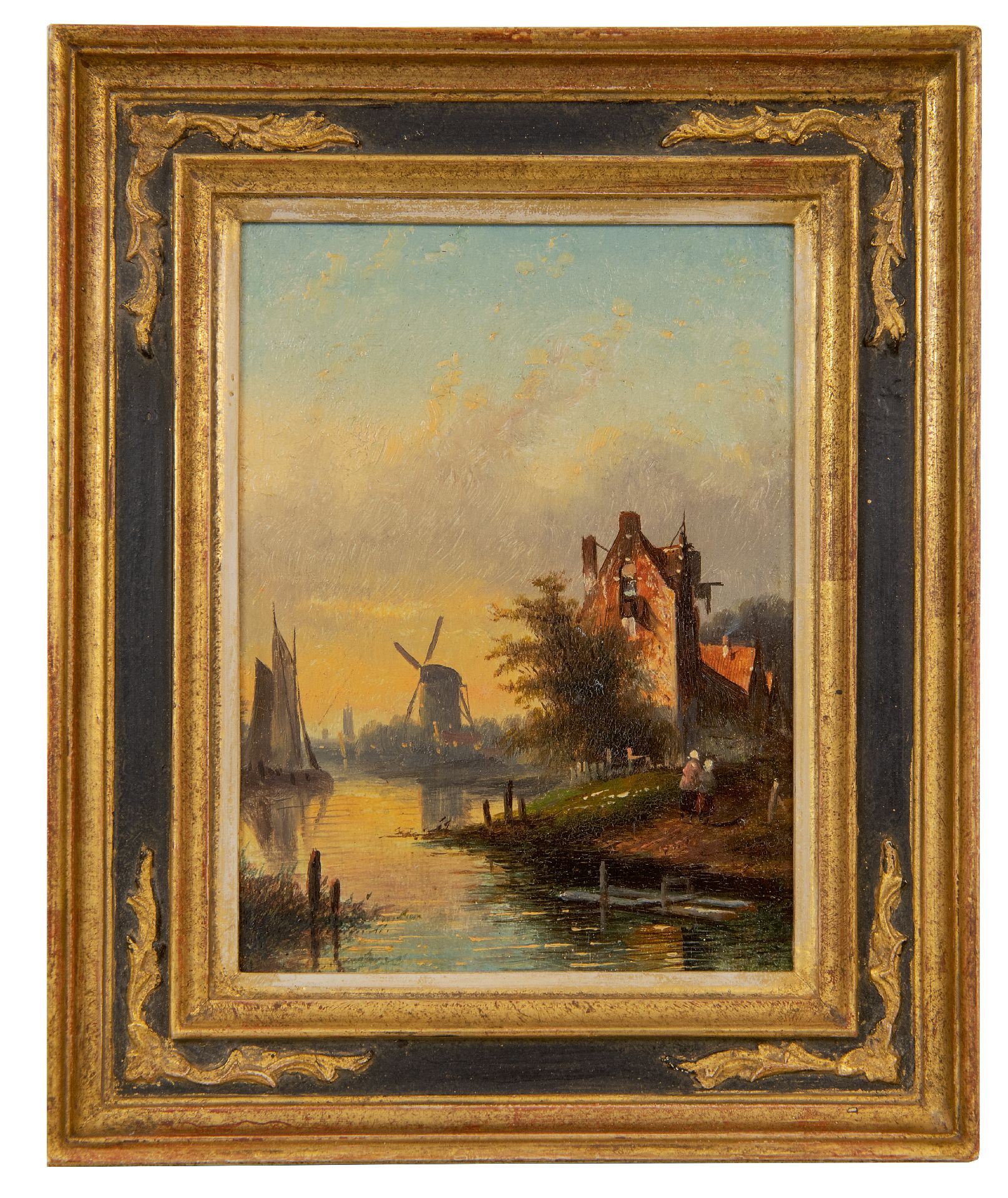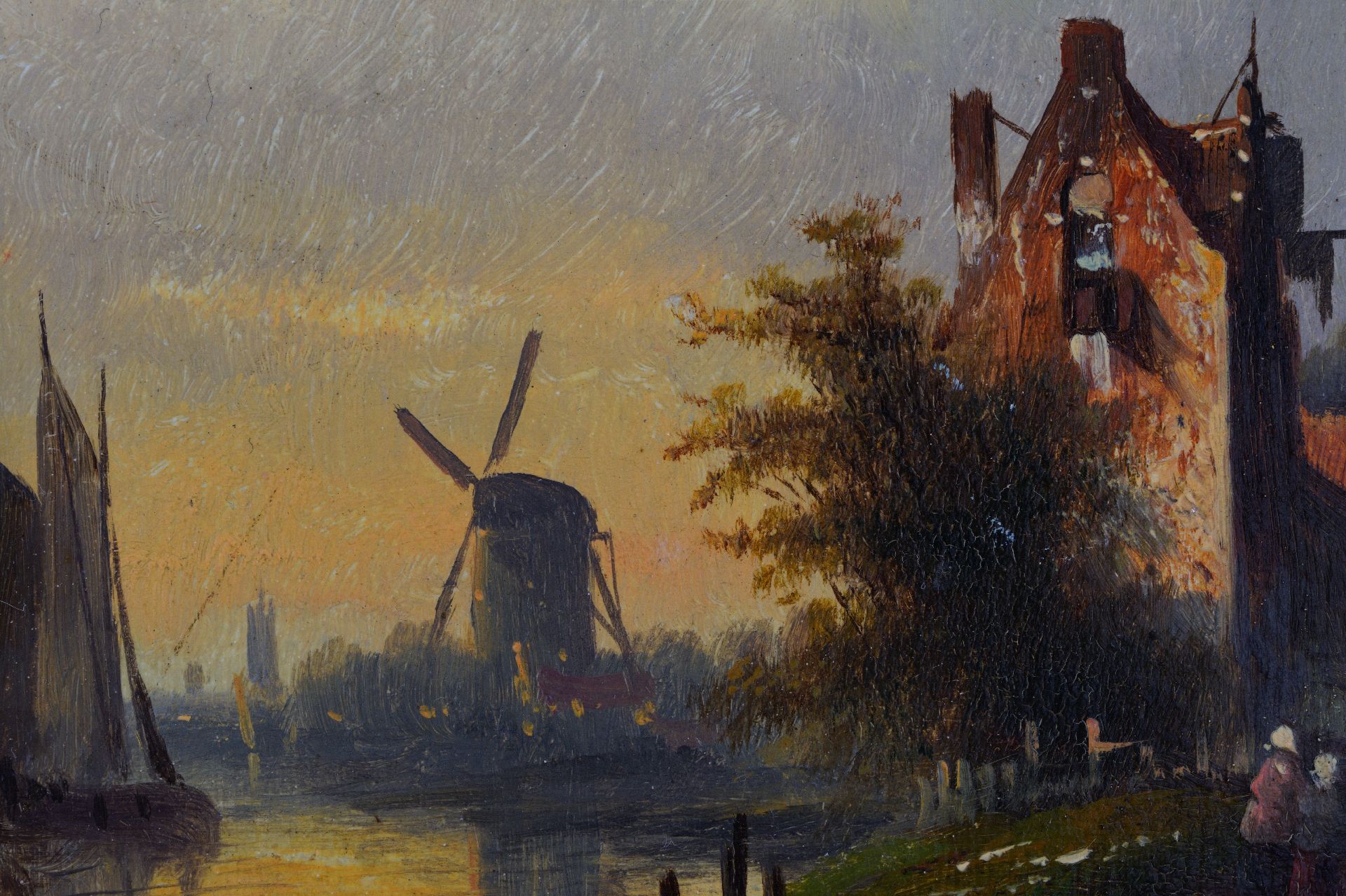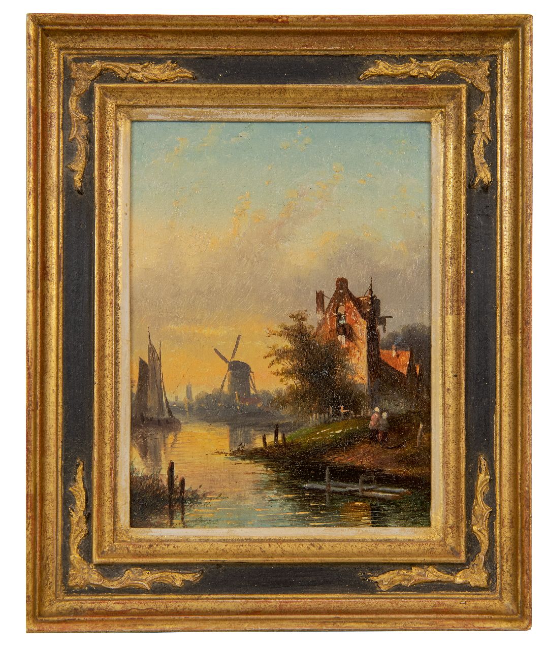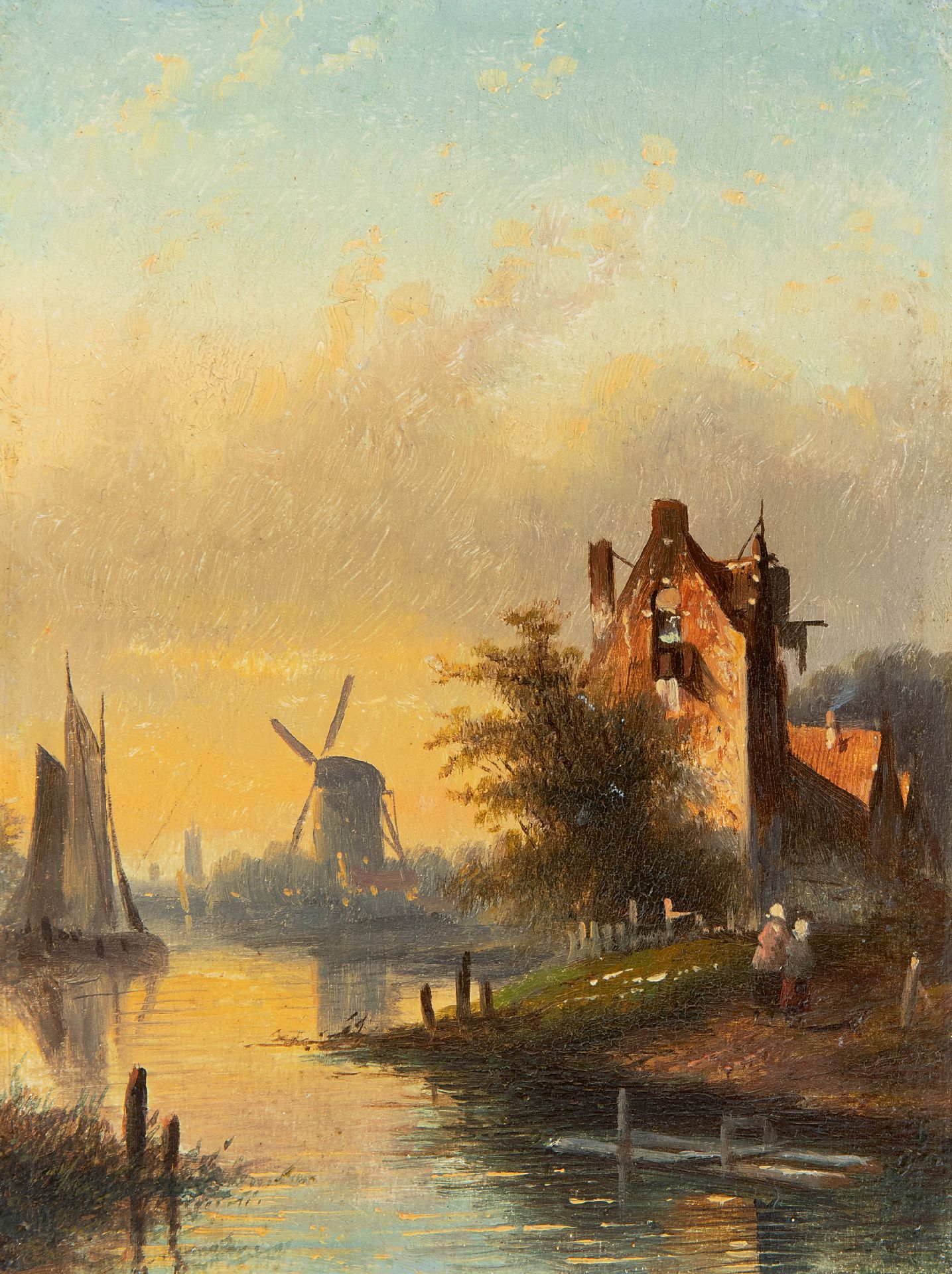 Jacob Jan Coenraad Spohler kunstwerk • schilderij • te koop Rivierlandschap met zeilschip, figuren en molen