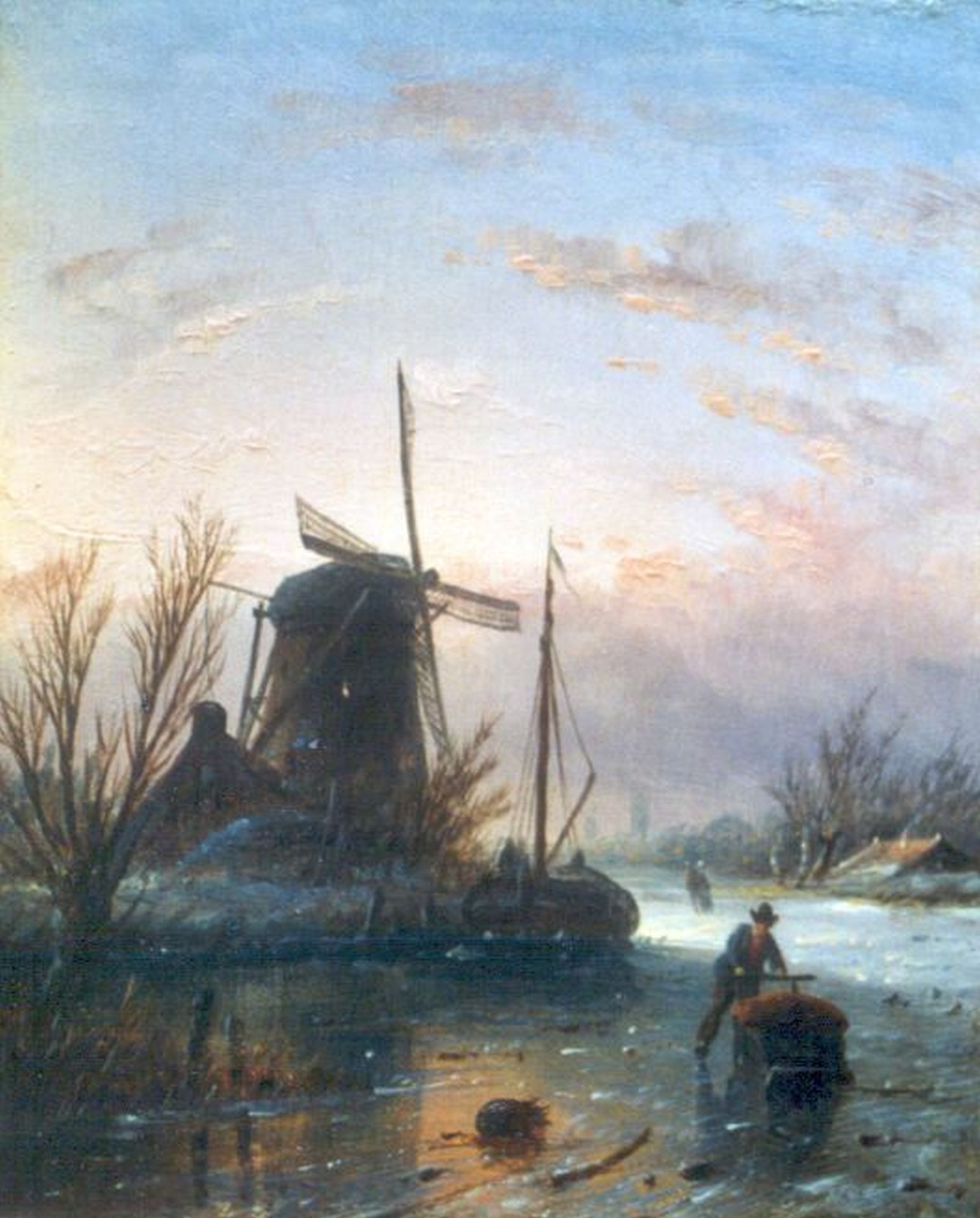 Jacob Jan Coenraad Spohler kunstwerk • schilderij • voorheen te koop Schaatser met duwslede bij een molen