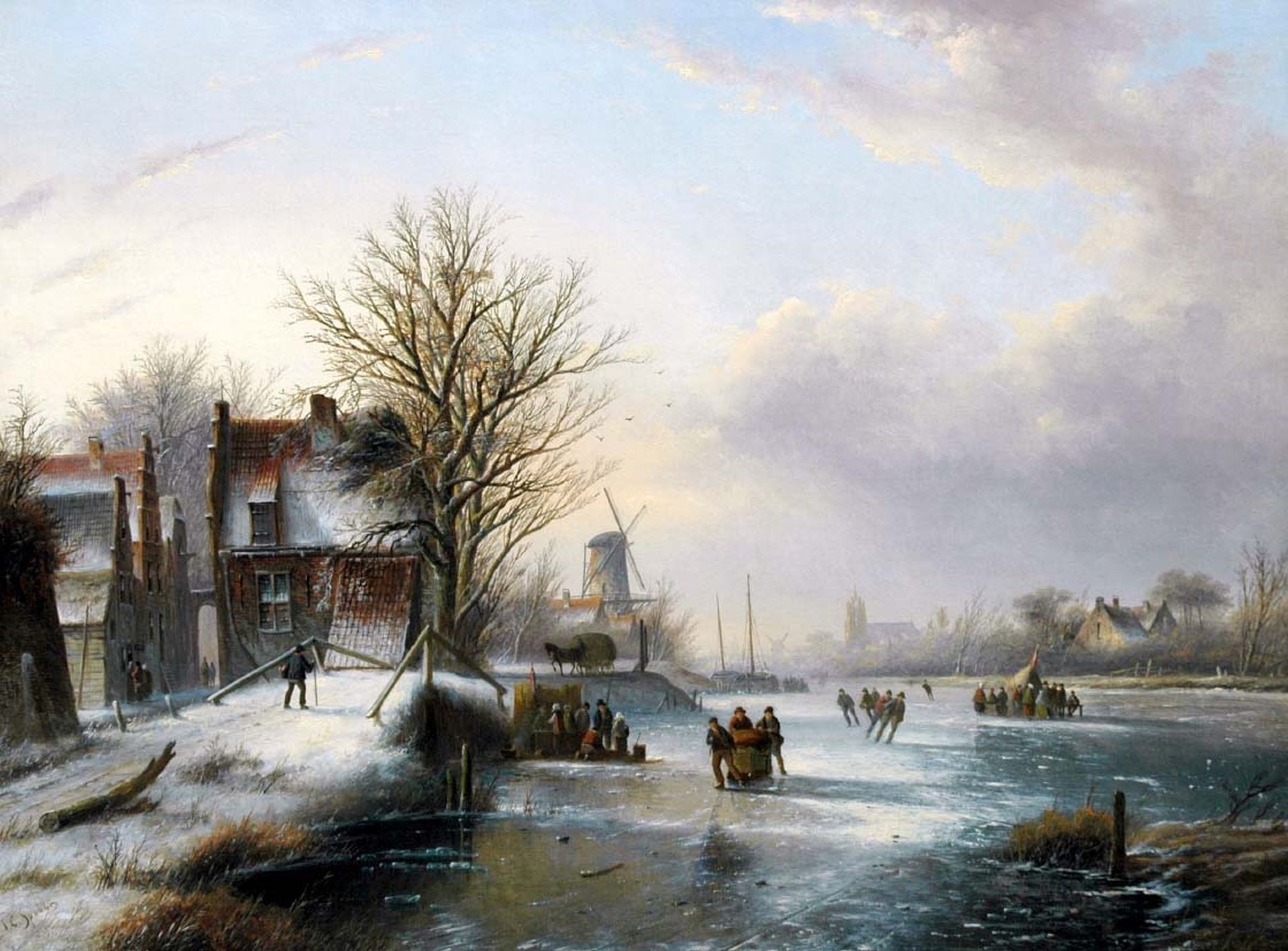 Jacob Jan Coenraad Spohler kunstwerk • schilderij • voorheen te koop Schaatsers op bevroren dorpsvaart