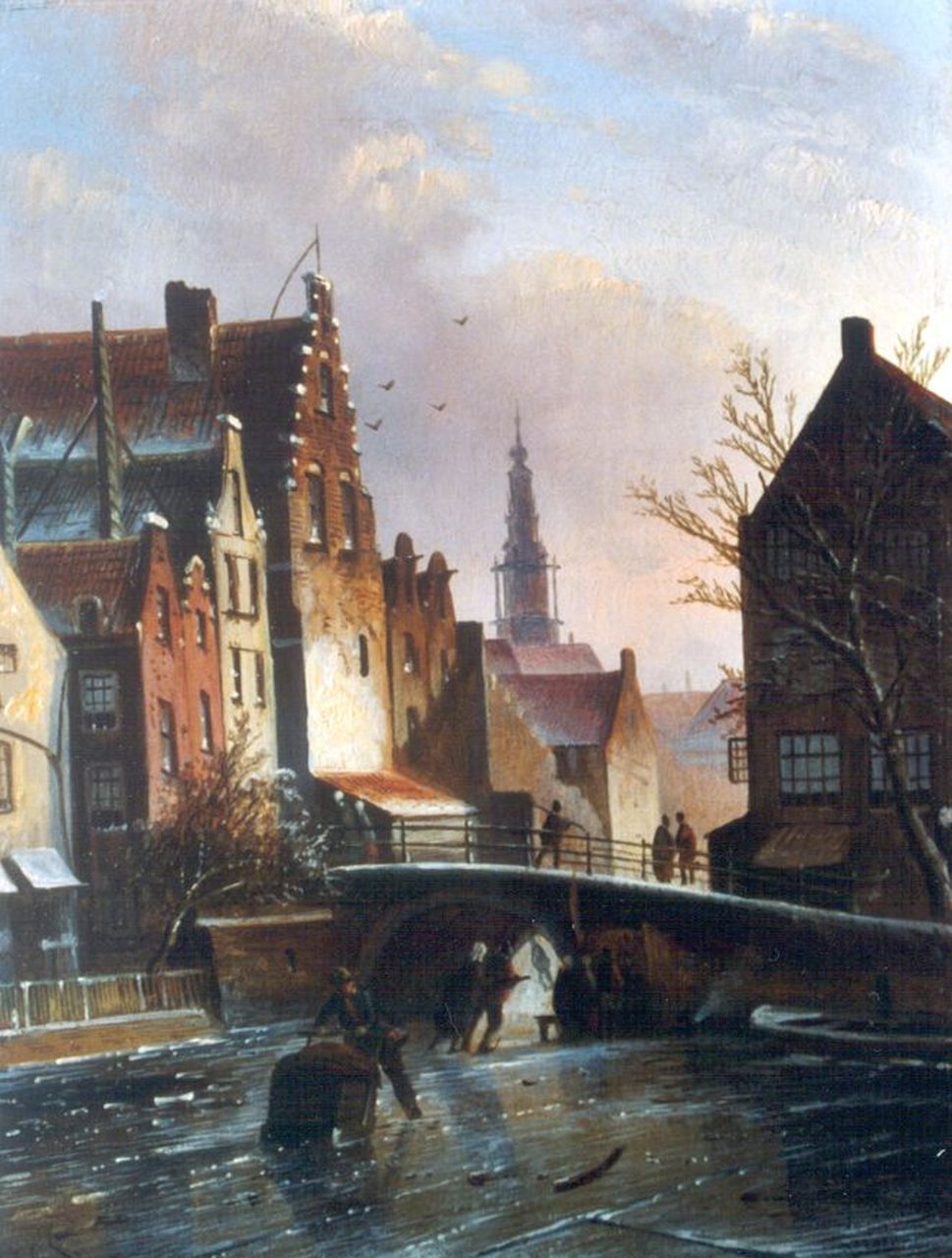 Jacob Jan Coenraad Spohler kunstwerk • schilderij • voorheen te koop Schaatsers op een stadsgracht