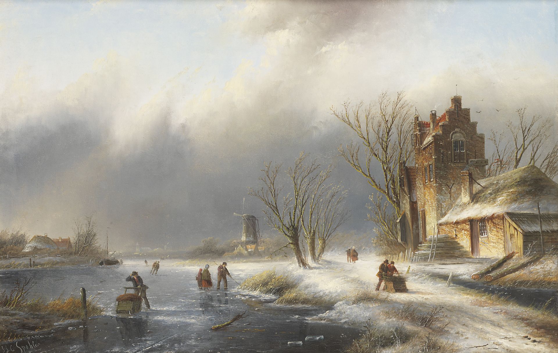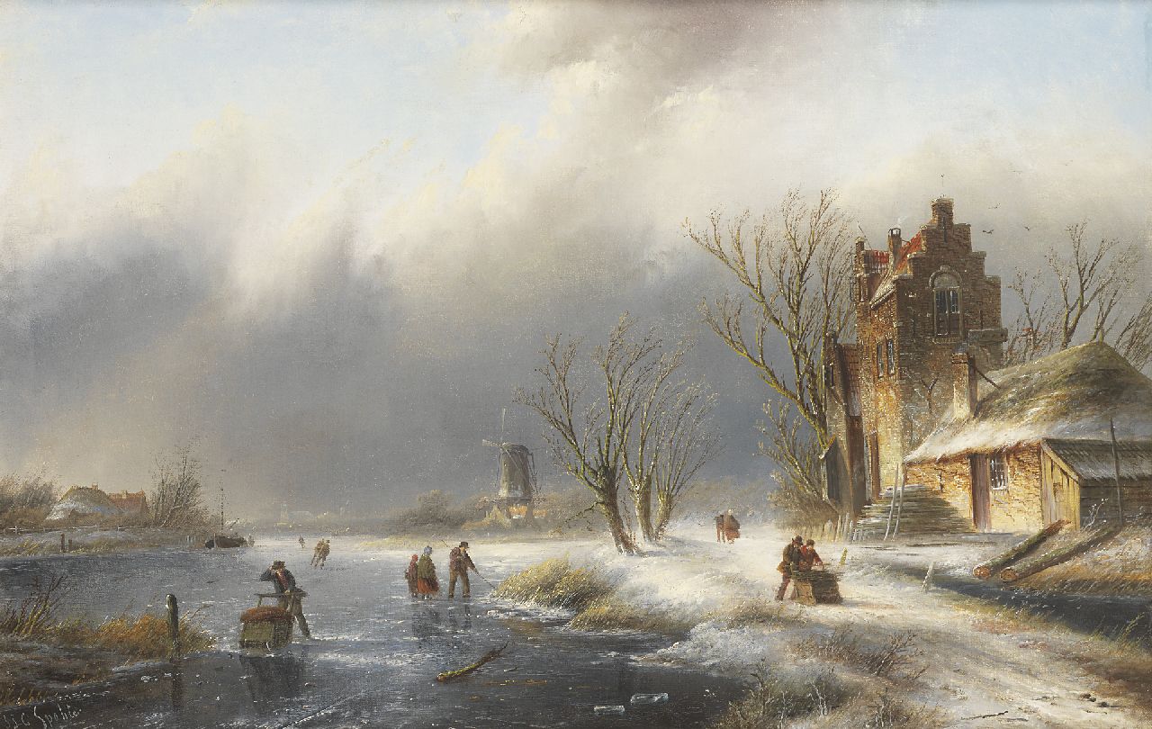 Jacob Jan Coenraad Spohler kunstwerk • schilderij • voorheen te koop Winterlandschap met figuren op en langs bevroren rivier
